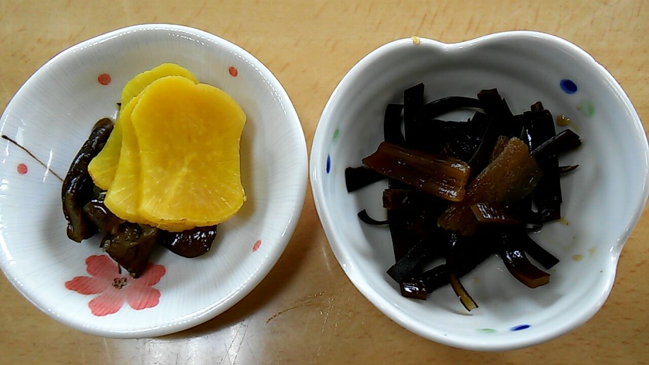 フキと昆布煮の小鉢、たくあんと胡瓜のお漬物
