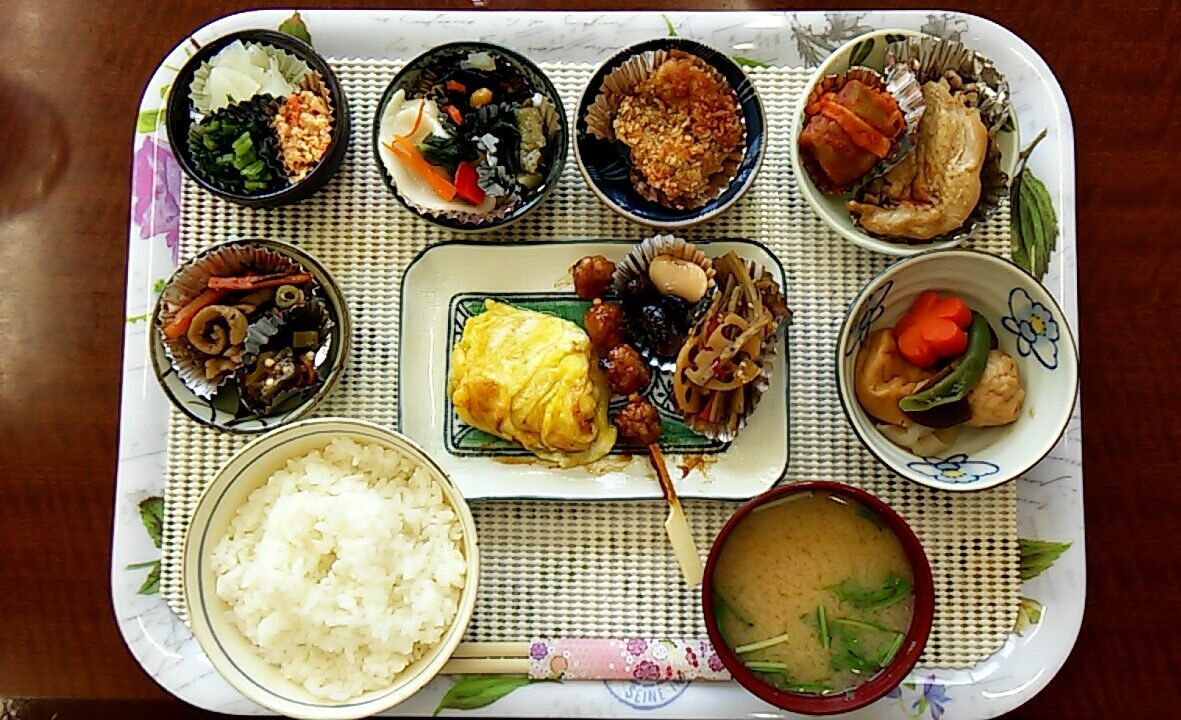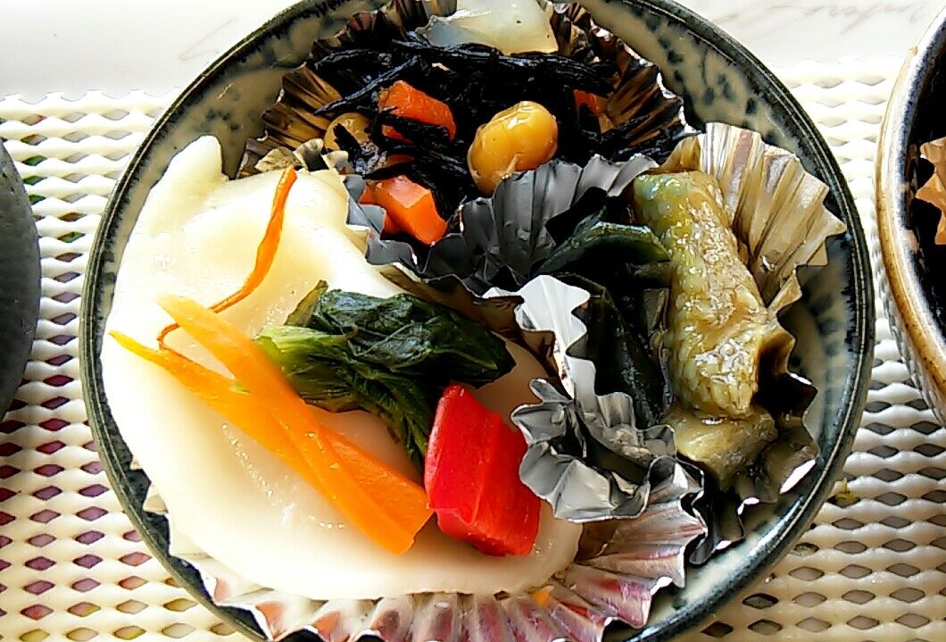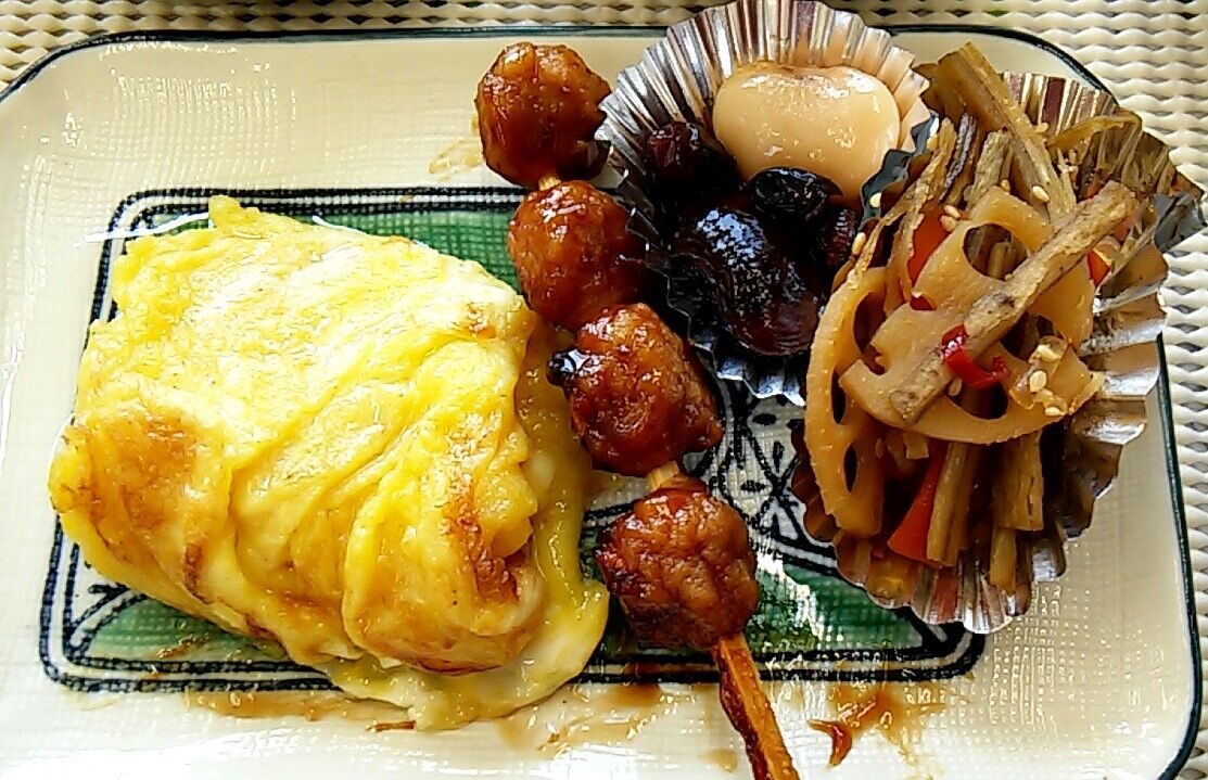甘い卵焼き・鶏つくね・甘い煮豆・根菜とくずきりのきんぴら
