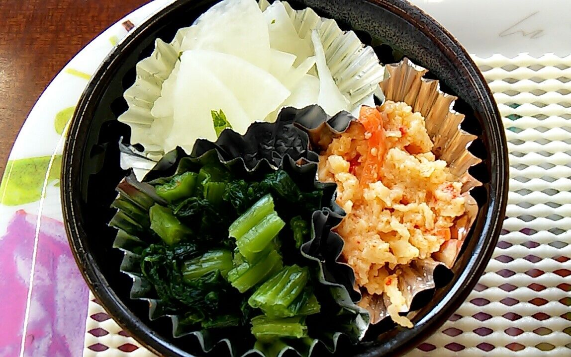 野沢菜漬け・大根の酢漬け・たらこと???の和え物