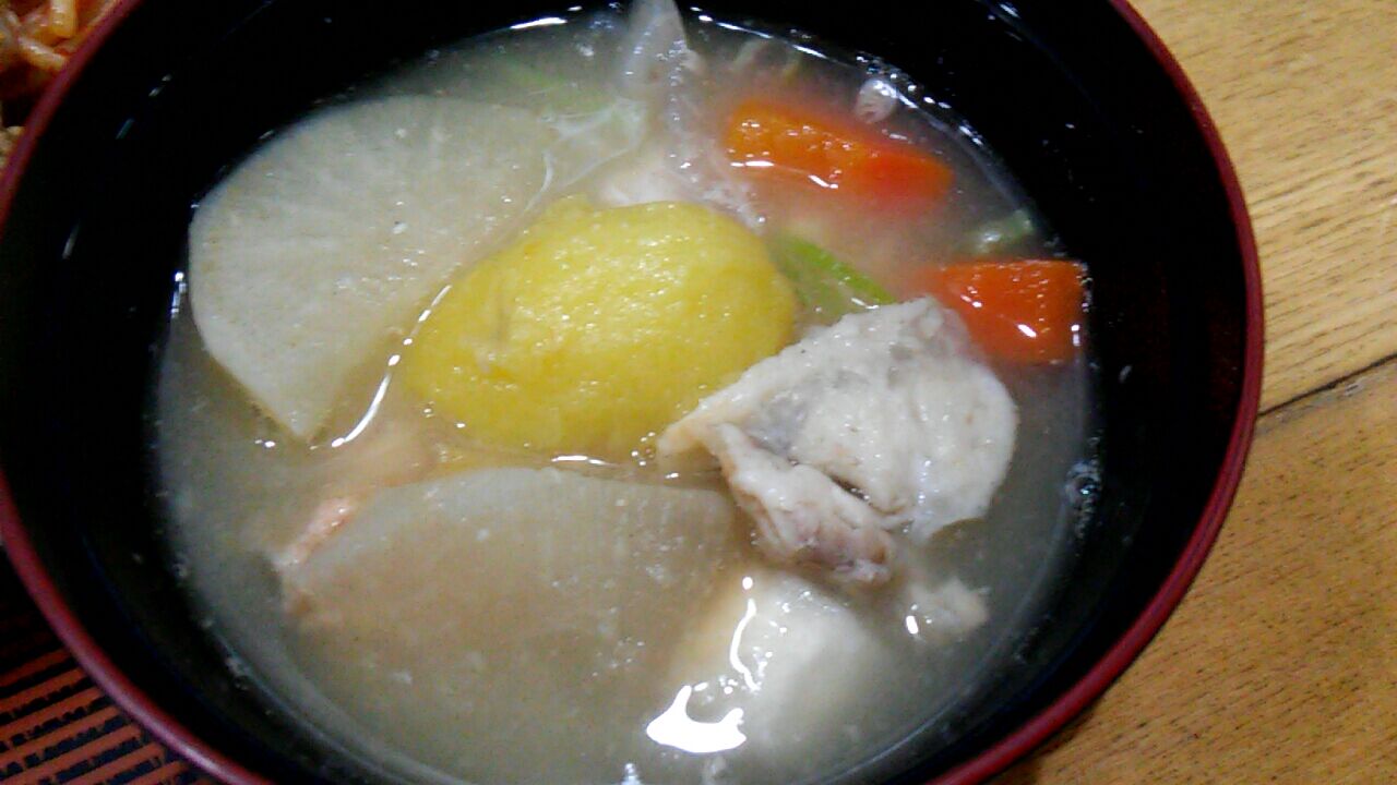 前回はジャガイモ・大根菜・揚げの味噌汁でしたが、具沢山の鮭あら汁だったぬん☆彡