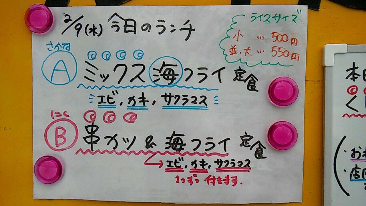Bランチ、串カツ&海フライ定食のご飯大盛り 550円