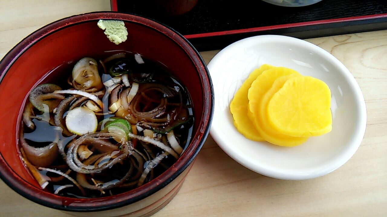 たっぷりのそばつゆ、たくあんが4切れは嬉しいんだぬん🎵
