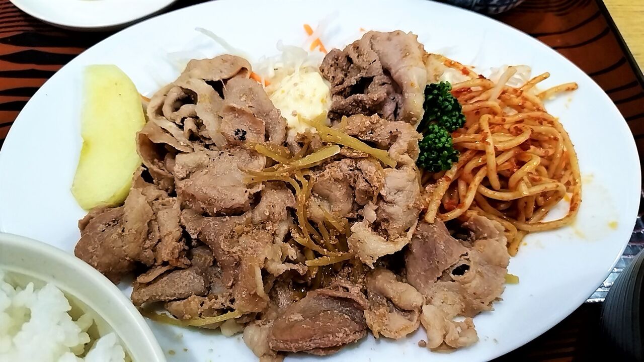 メインのお皿には生姜焼き肉・ナポリタン・大根とキャベツサラダ・リンゴ・マヨ嬢☆彡