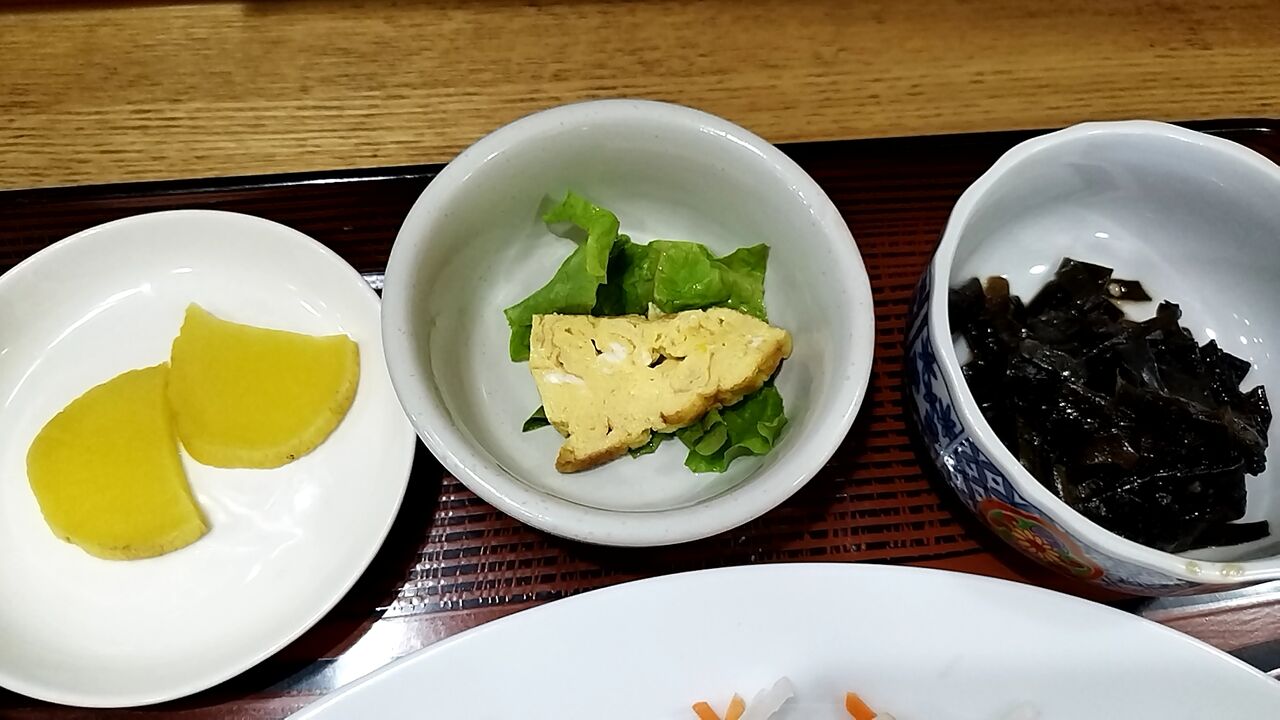 メイン皿・ご飯・味噌汁・漬け物・小鉢2種と言う内容☆彡