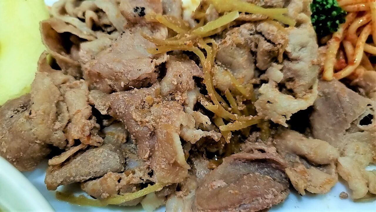 生姜焼き肉、生姜の風味は弱めでしたにゃ。
