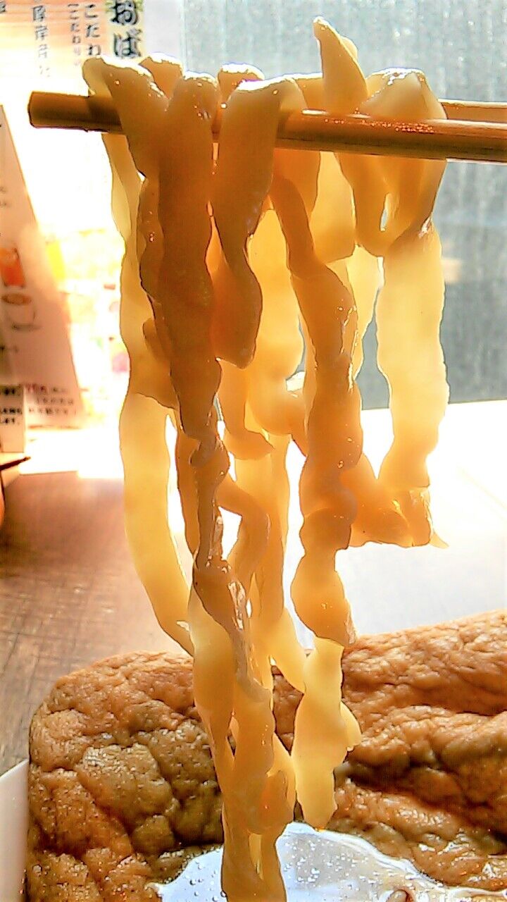 平たい手打ちの縮れ麺、コシの強さがミニスカニーハイ&ニット巨乳並みの破壊力( ̄◇ ̄)