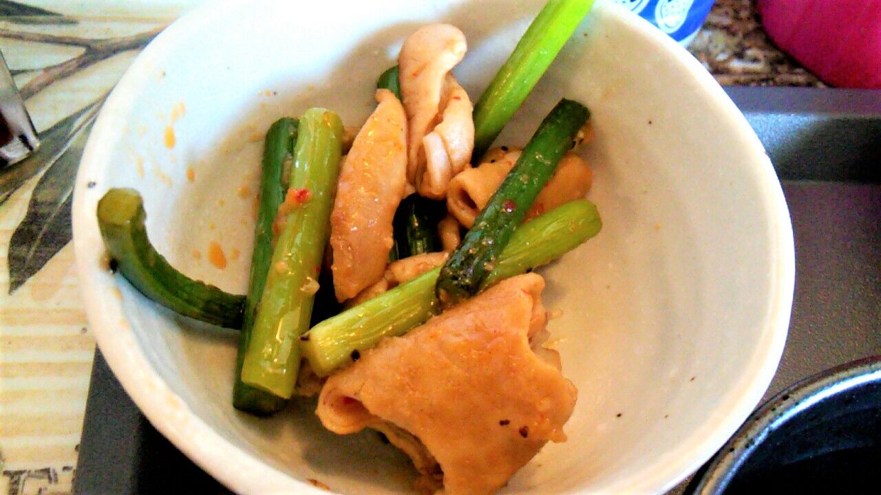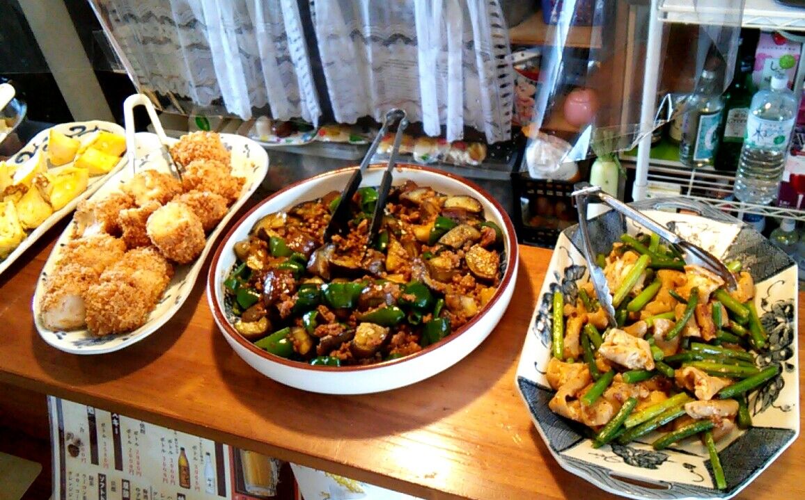 選んだおばんざいは、ホルモンとニンニクの芽炒め・麻婆茄子