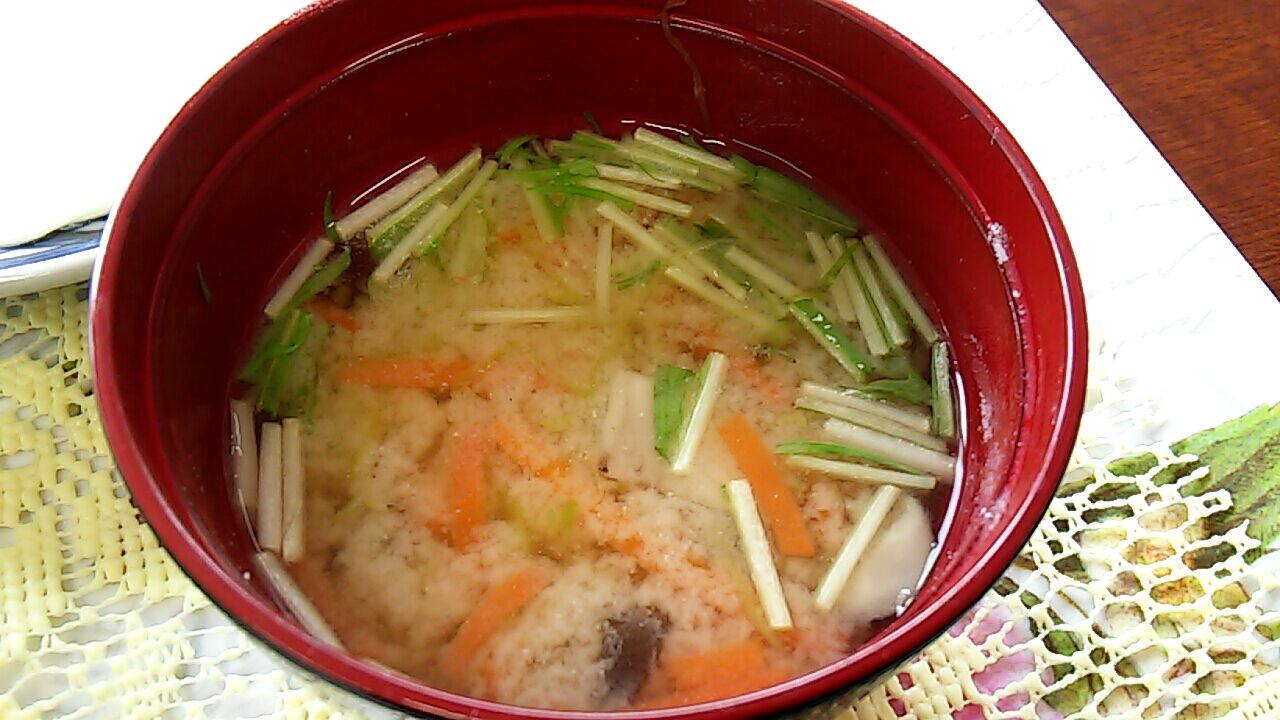 彩り野菜の味噌汁、結構濃い目でしたにゃ。