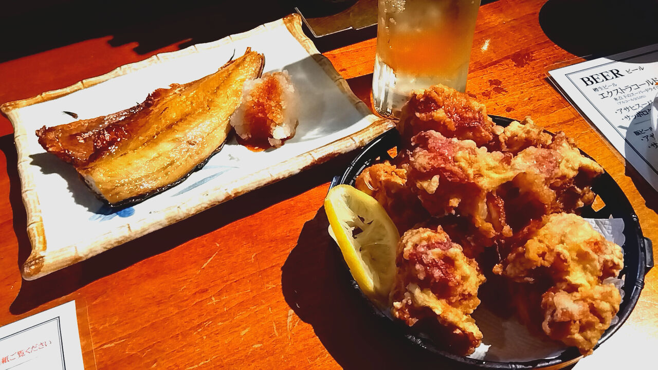 塩辛気分が失せたのでキャンセル、ほっけ半身焼き420円とざんぎ580円をオーダー。