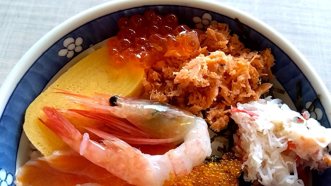 具材はマグロ・海老・カニ・サーモン・帆立・鮭フレーク・とびっこ・イクラ・卵焼き。