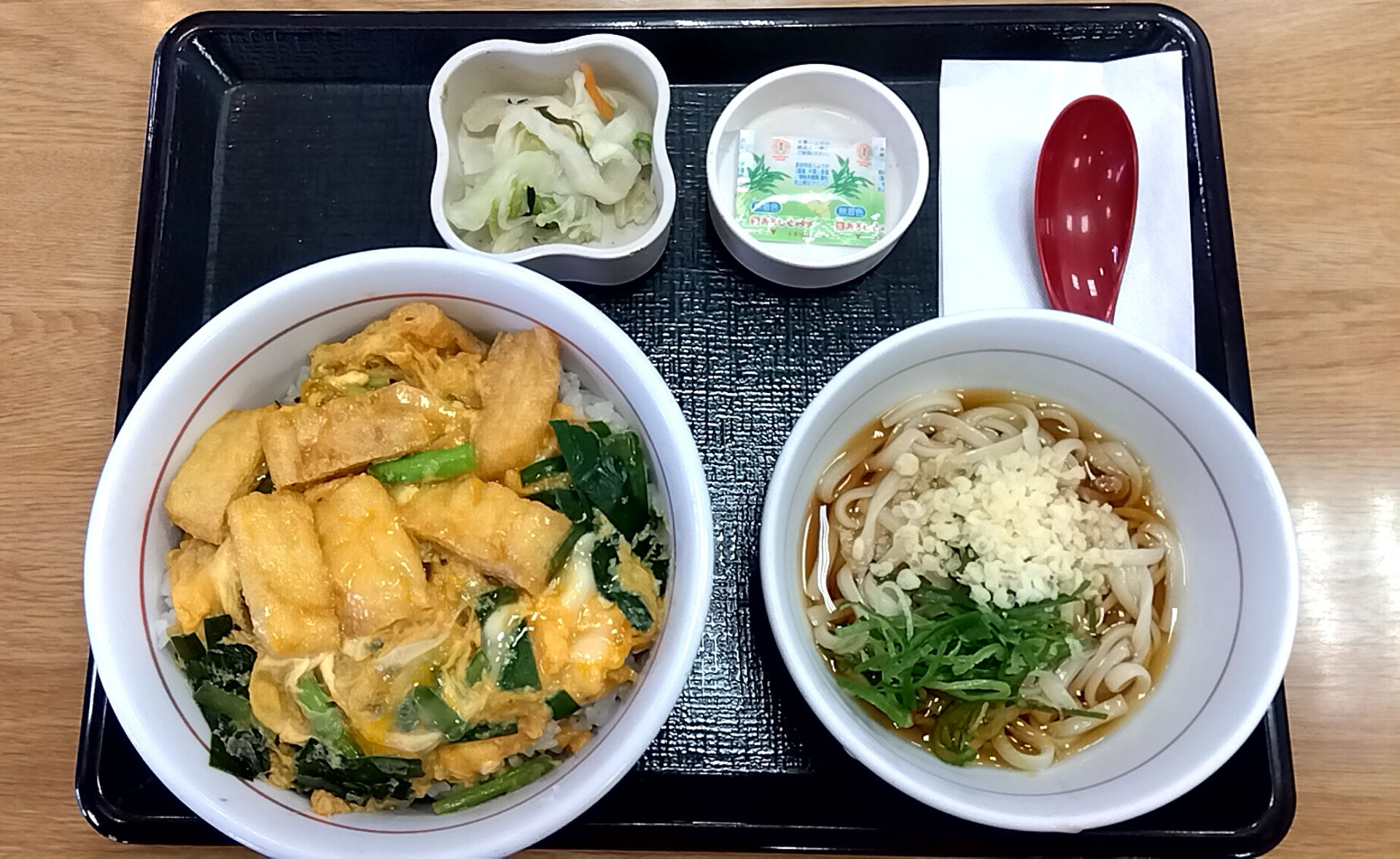 お揚げとにらの玉子丼(ご飯大盛り)と小うどん京風つけものセットの評価は・・・