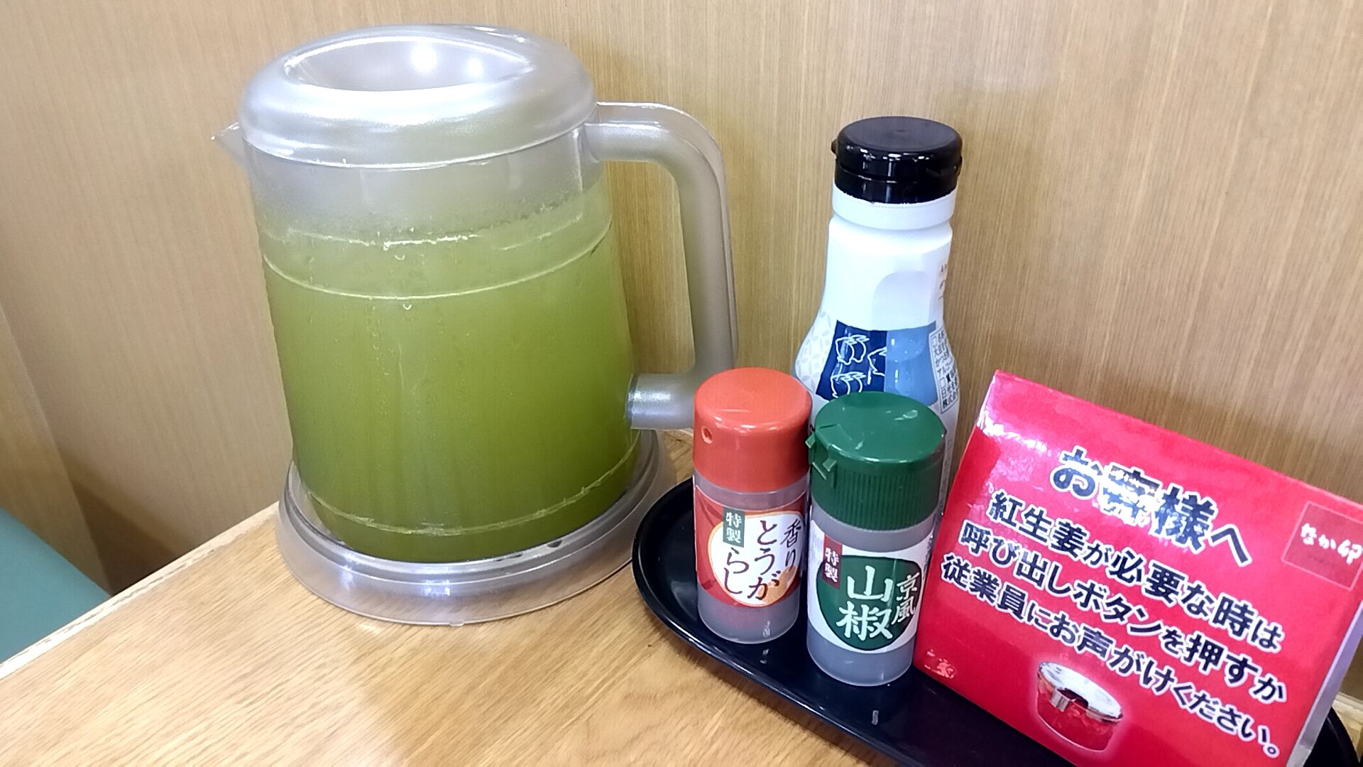 冷たい緑茶は嬉しいんだぬ、席にも置いてありました。