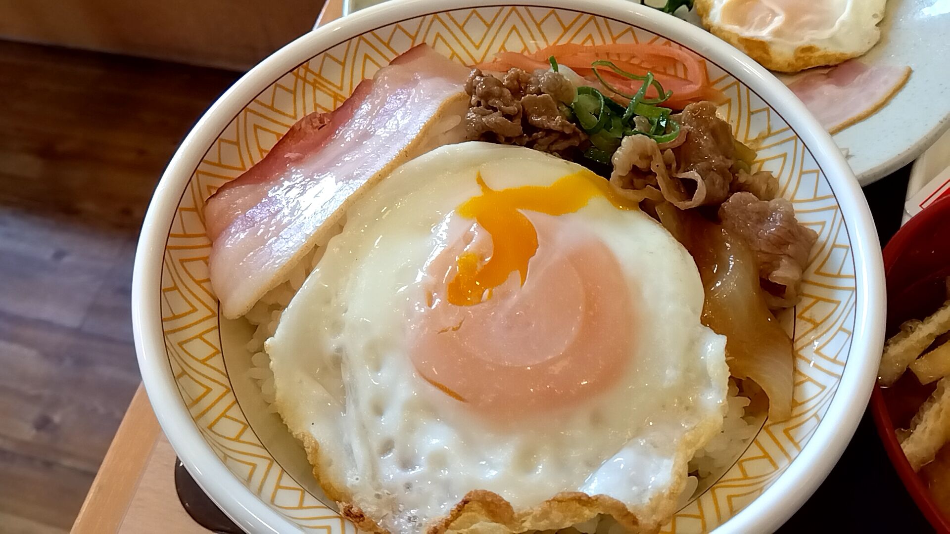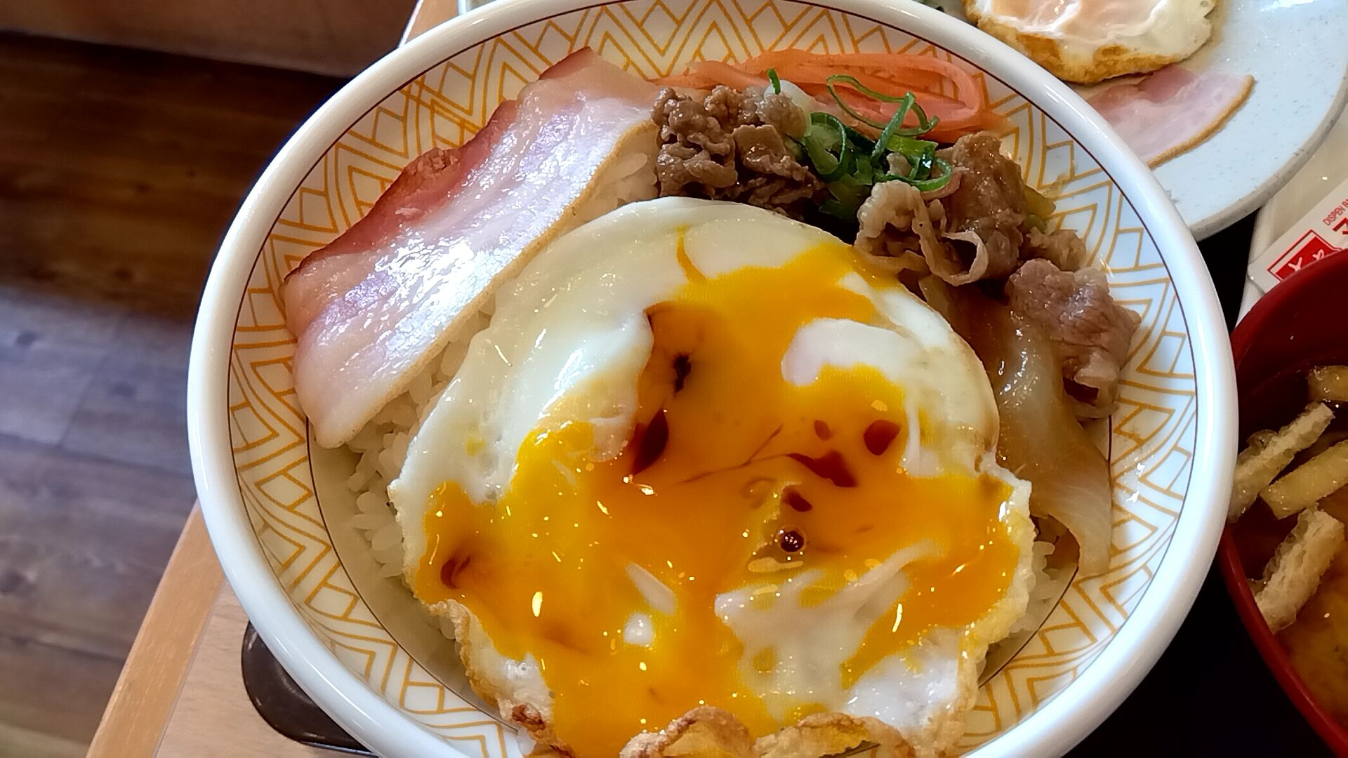 牛小鉢ベーコンダブルエッグ定食の評価は・・・
