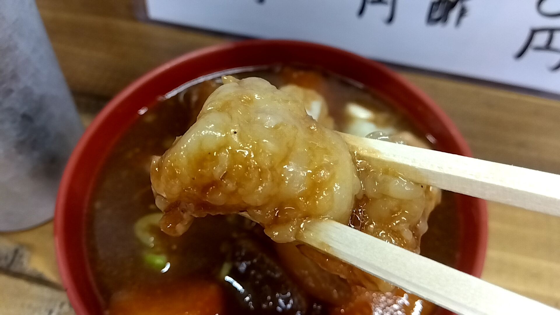 具材は牛モツ・大根・人参・蒟蒻・ゴボウ・ネギ、メッチャ濃い味で酒が捗る〜〜〜🍺
