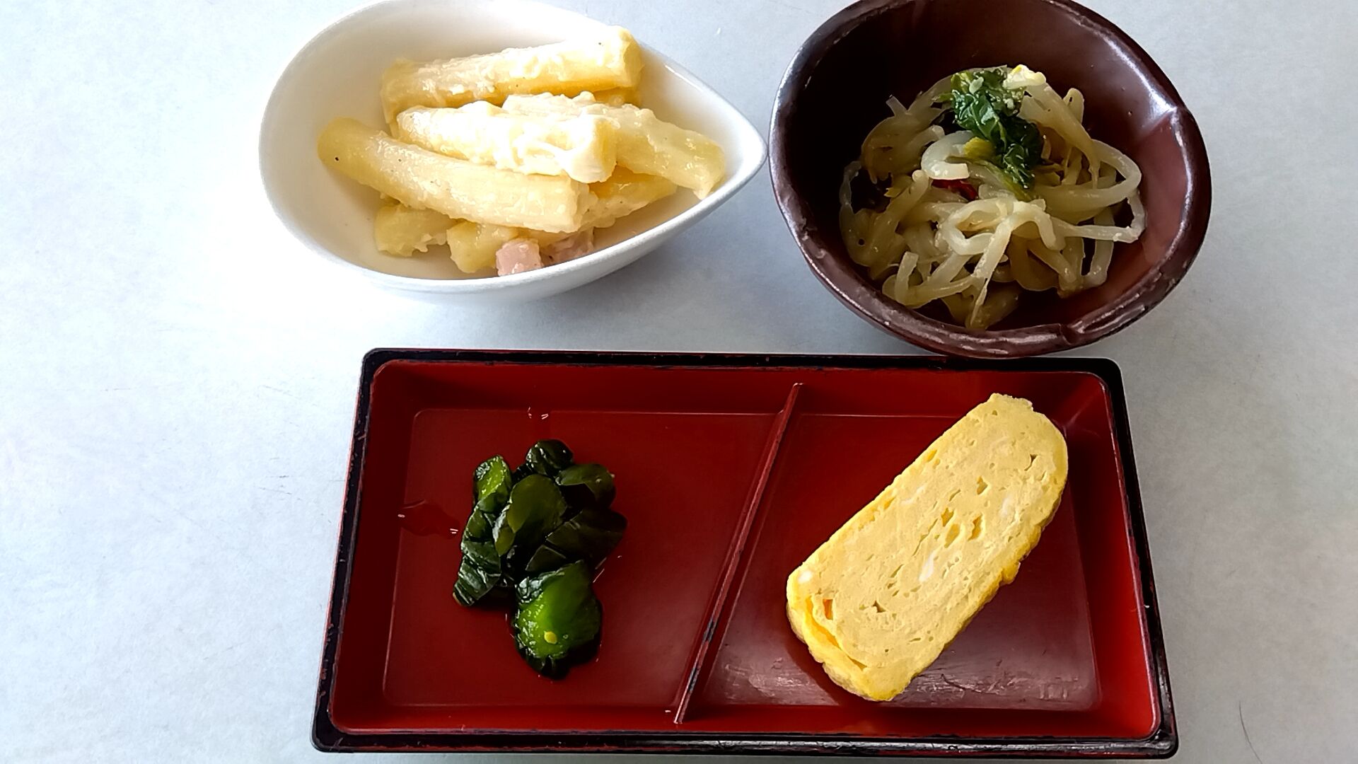 ペンネのマヨ和え・モヤシの味噌風味和え・卵焼き・かっぱ漬け。