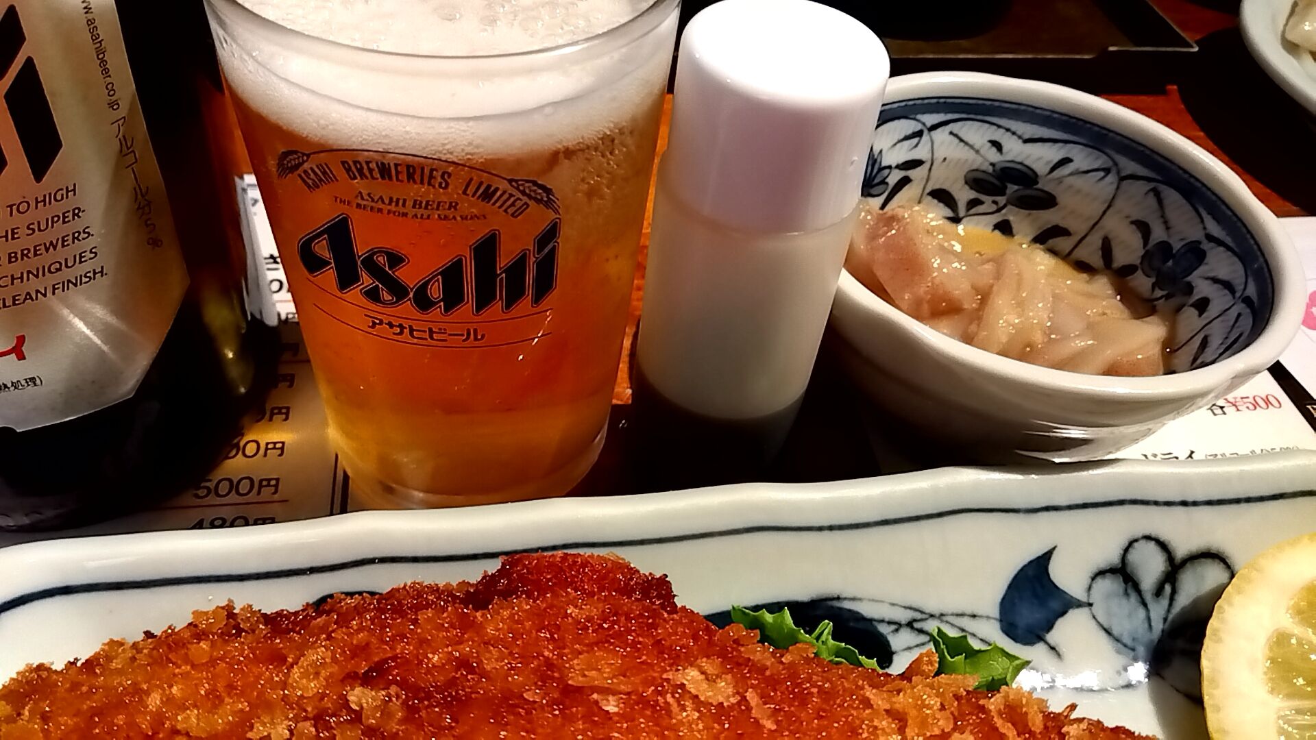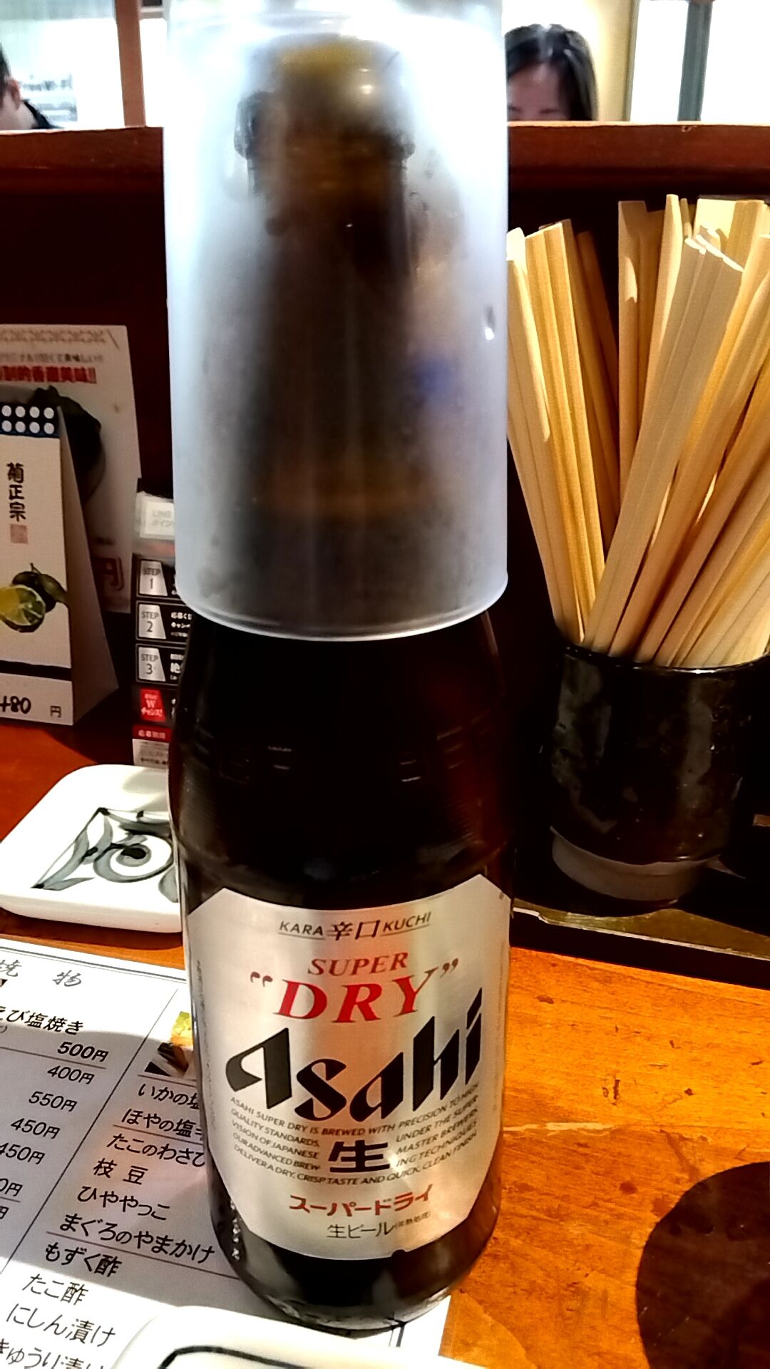 まぁまぁ、心を落ち着かせて瓶ビールアサヒスーパードライ中瓶580円