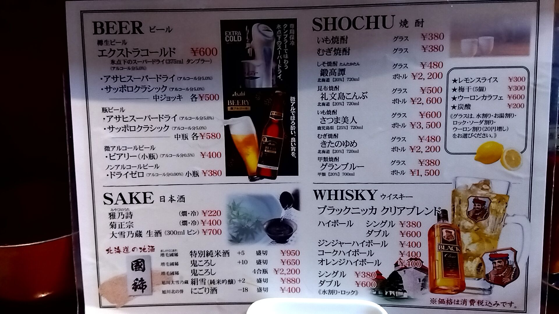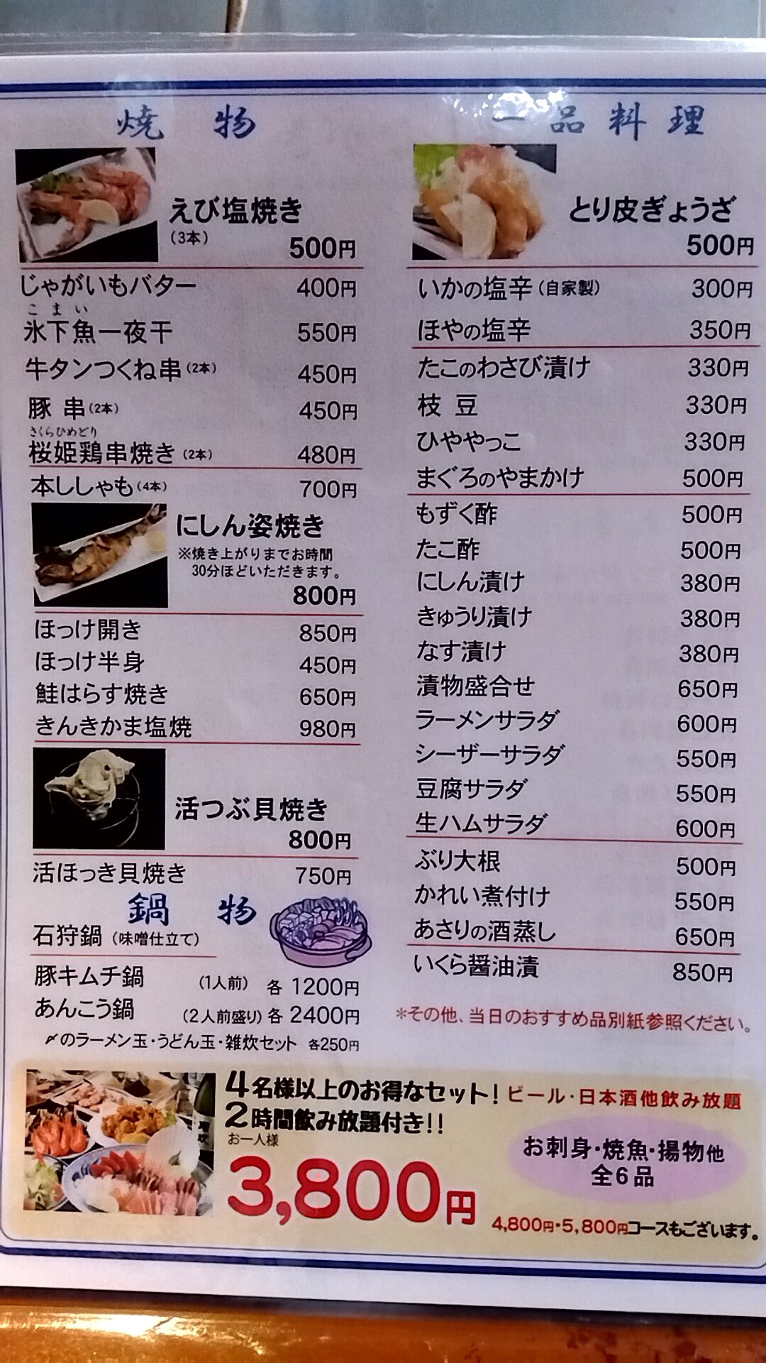 昔は鍋物・刺盛り・枝豆・お通し・あら汁・90分飲み放題=2000円と言う神セットがあった。