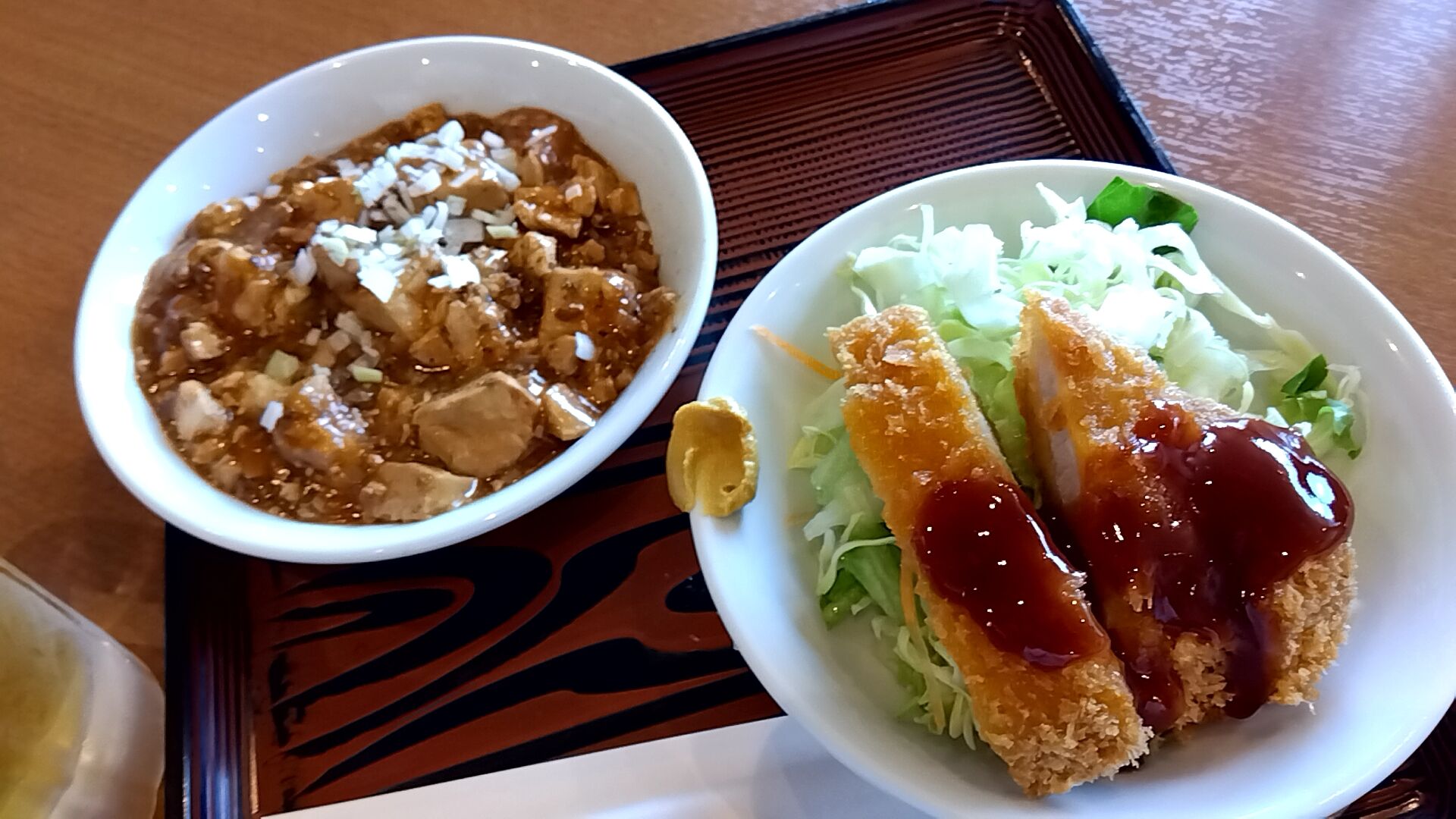 お料理2品はとんかつと麻婆豆腐でした、ドリンク2杯でコレはお得感ありですにゃよ☆彡