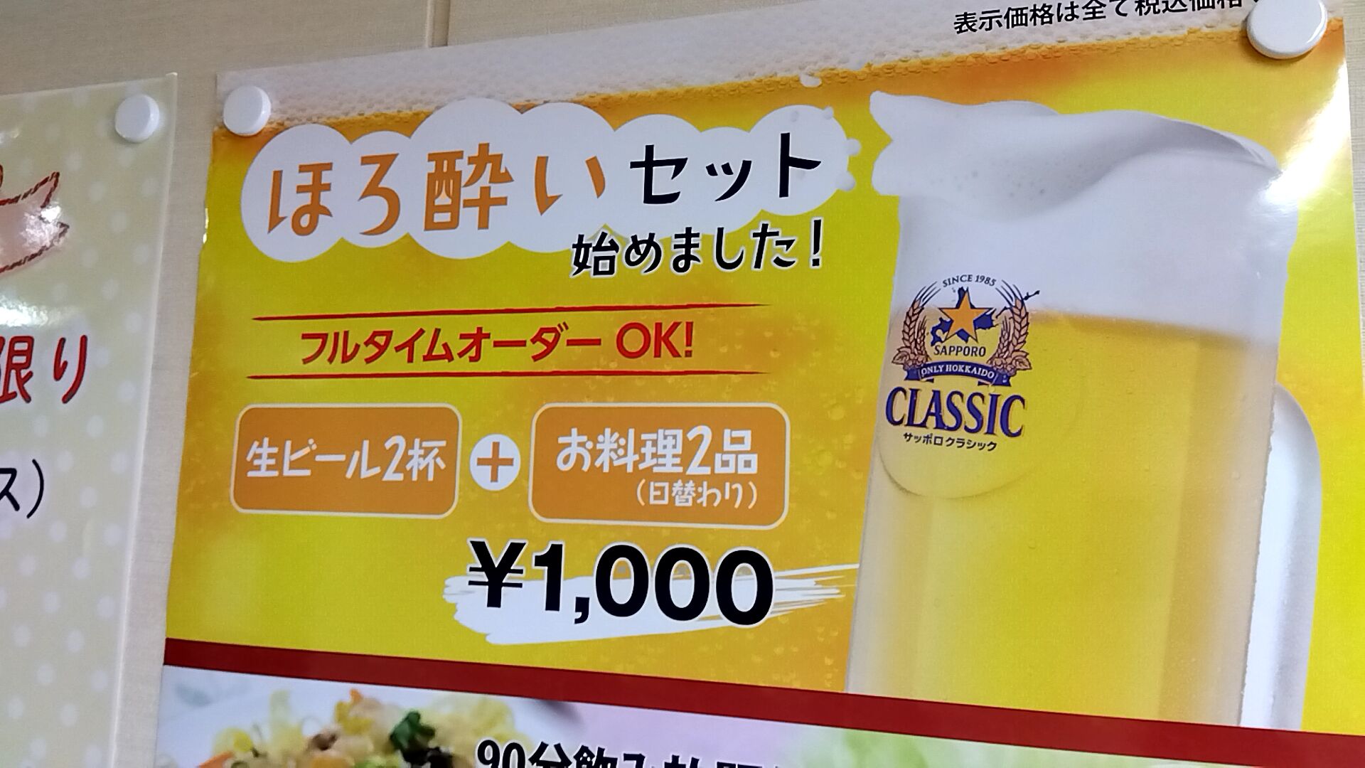 生ビール2杯とお料理2品で1000円ポッキリと言うオトクなセット(=^・^=)