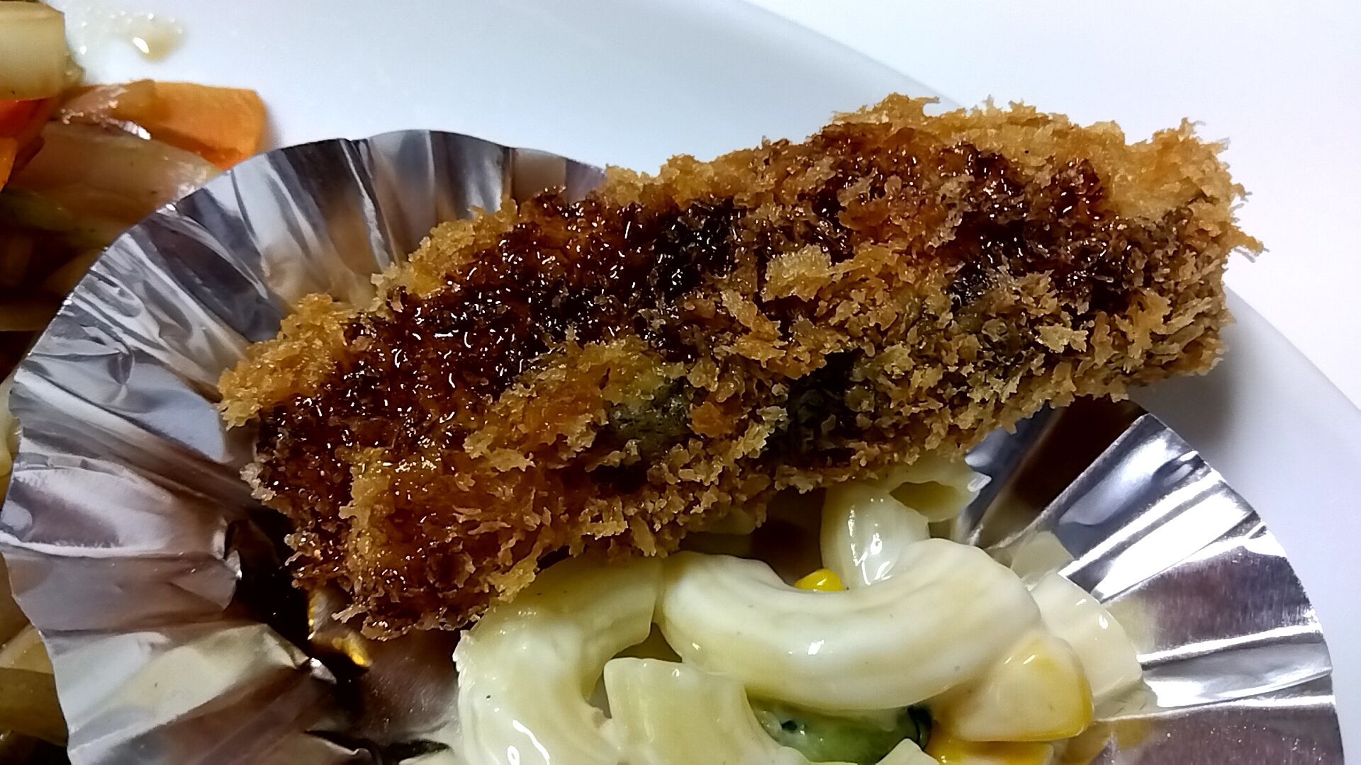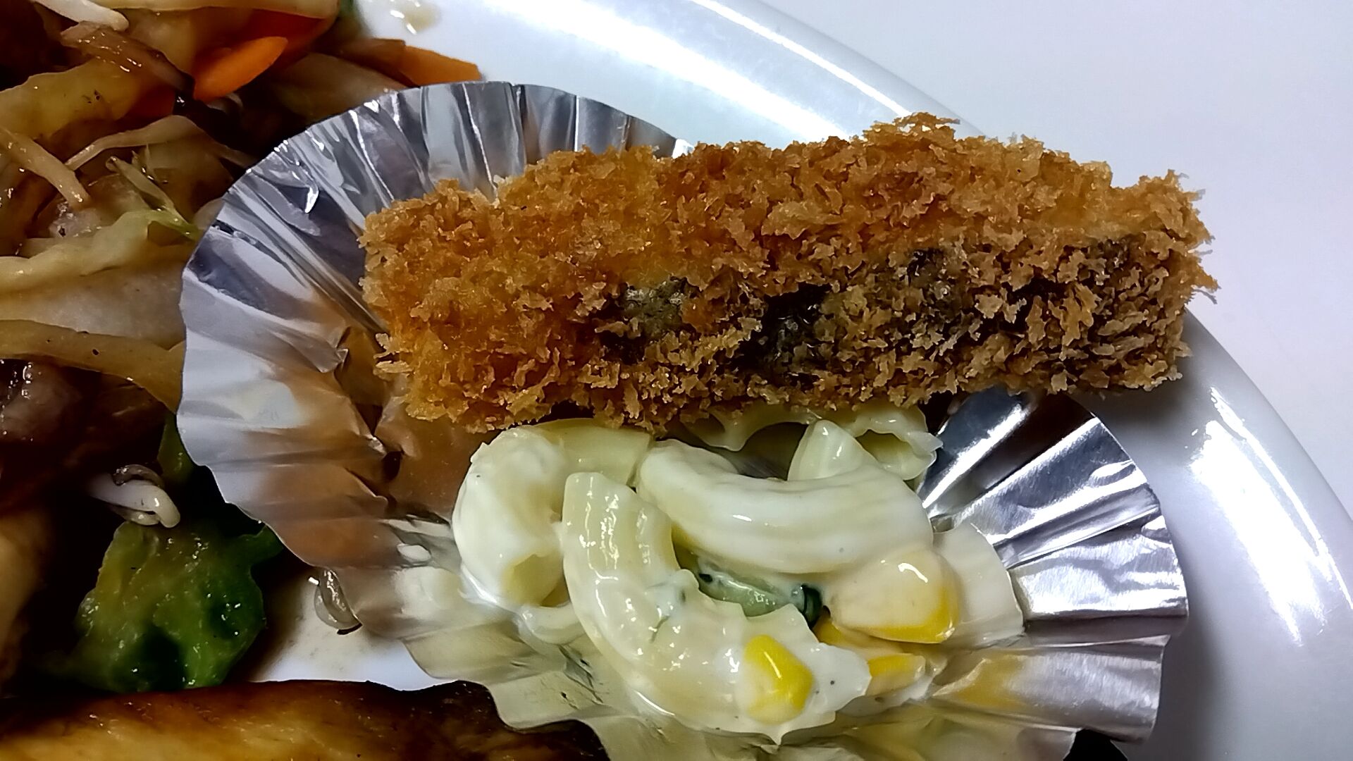 日替わりのおかずは鱈フライとマカロニサラダだったにゃよ(=^・^=)