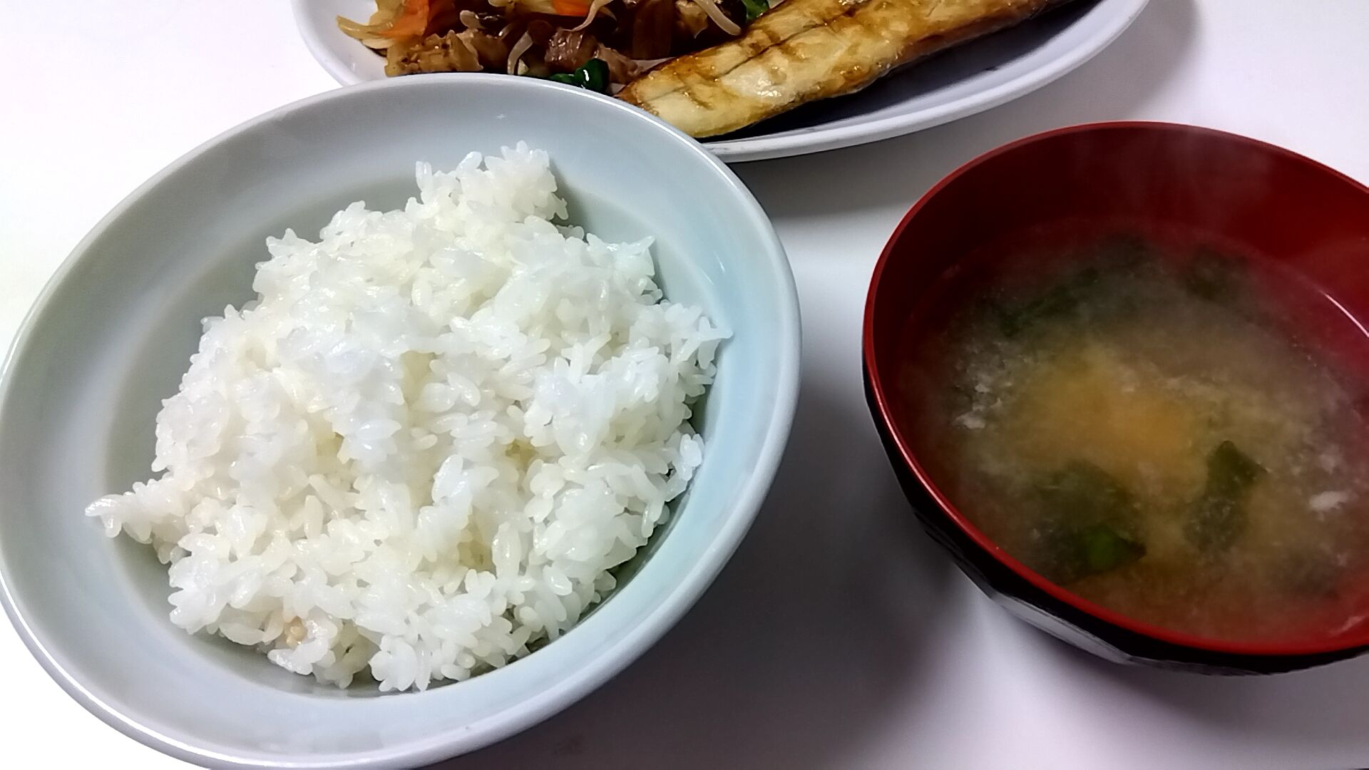 ご飯・ワカメと豆腐の味噌汁、日本の食卓。