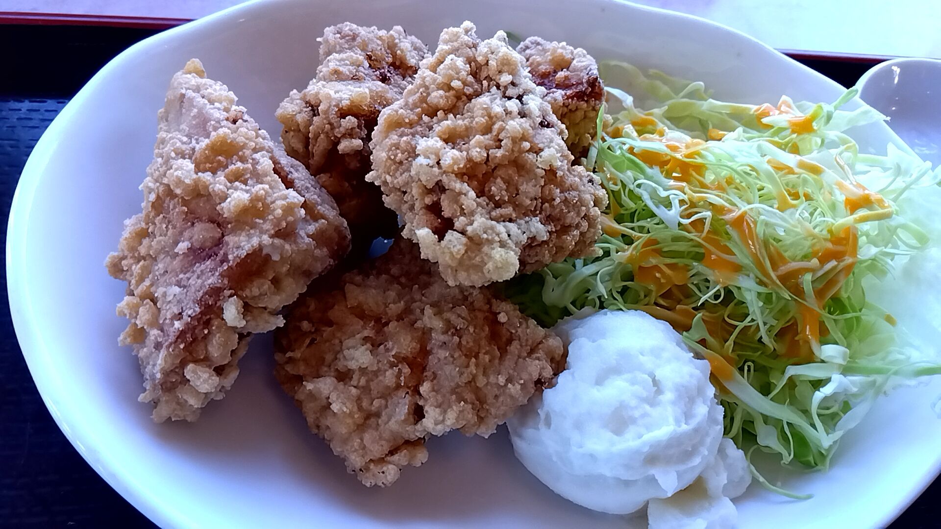 鶏もも肉の唐揚げが5個、ポテサラと千切りキャベツサラダ🌸