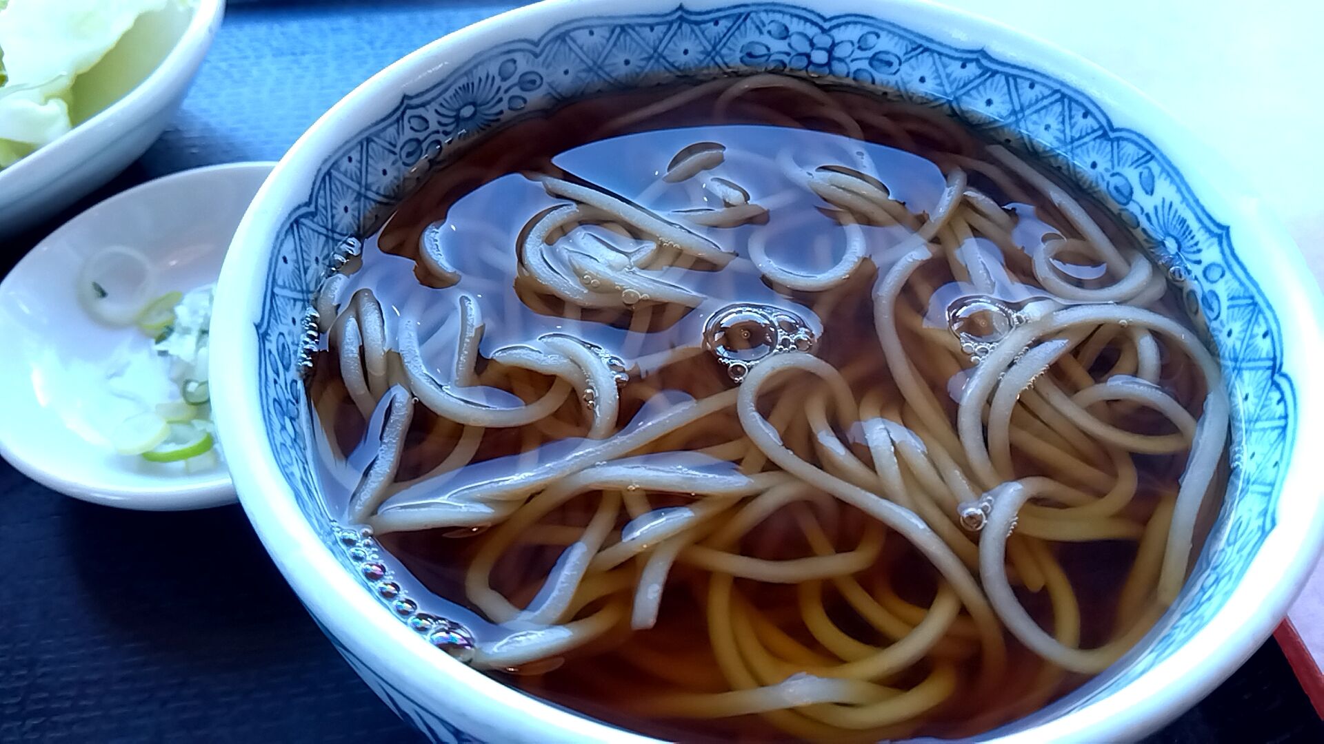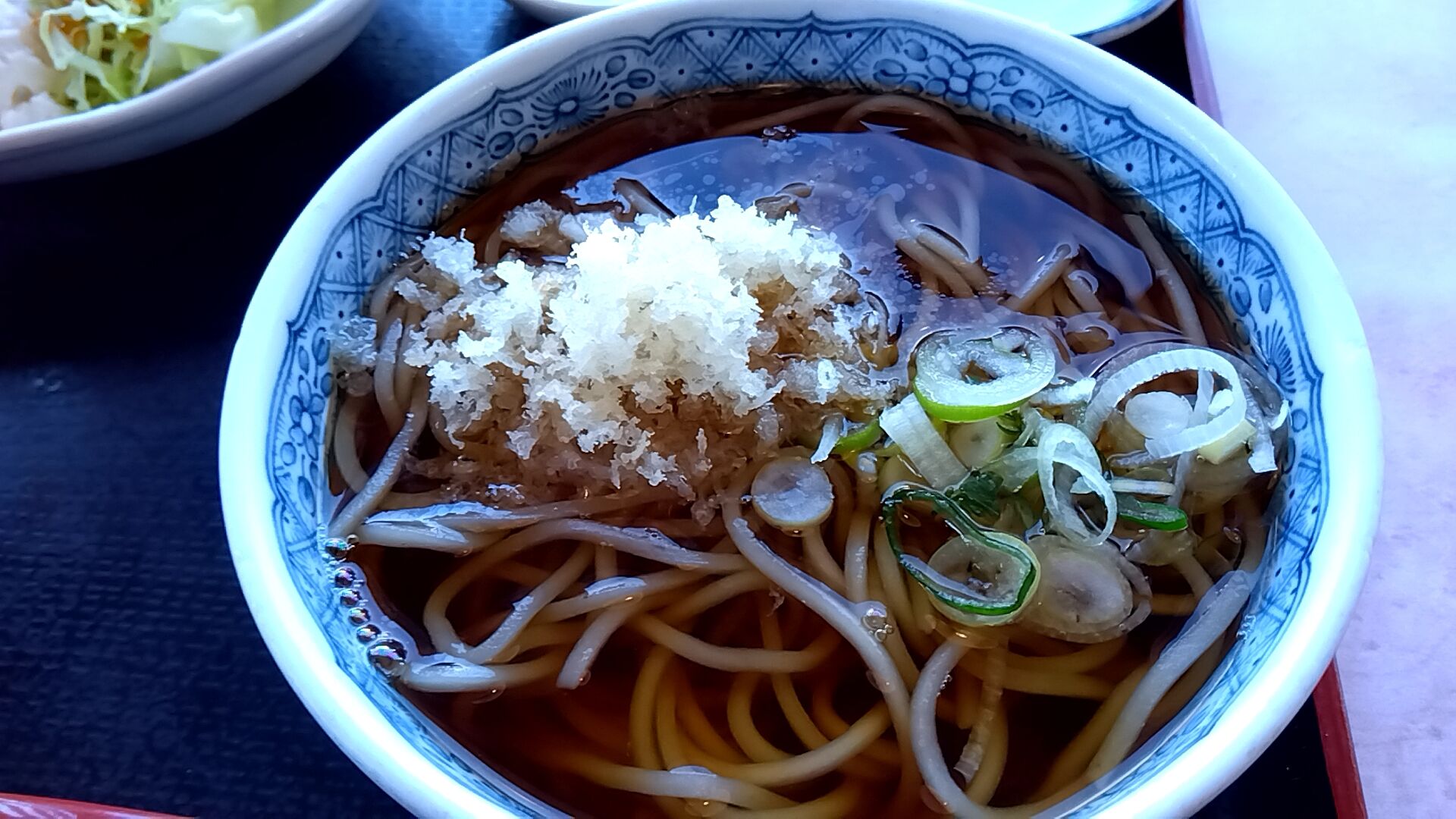 かけそばと薬味のネギ・天かす。