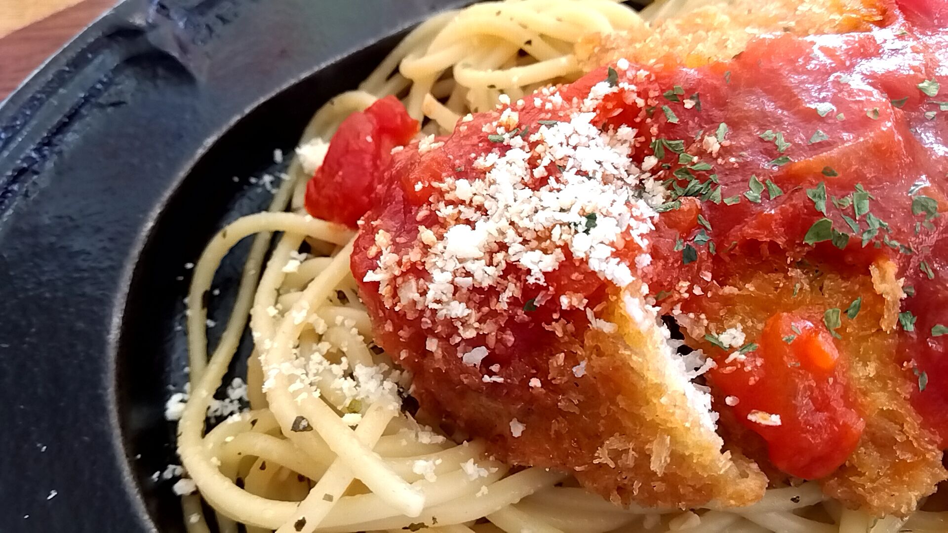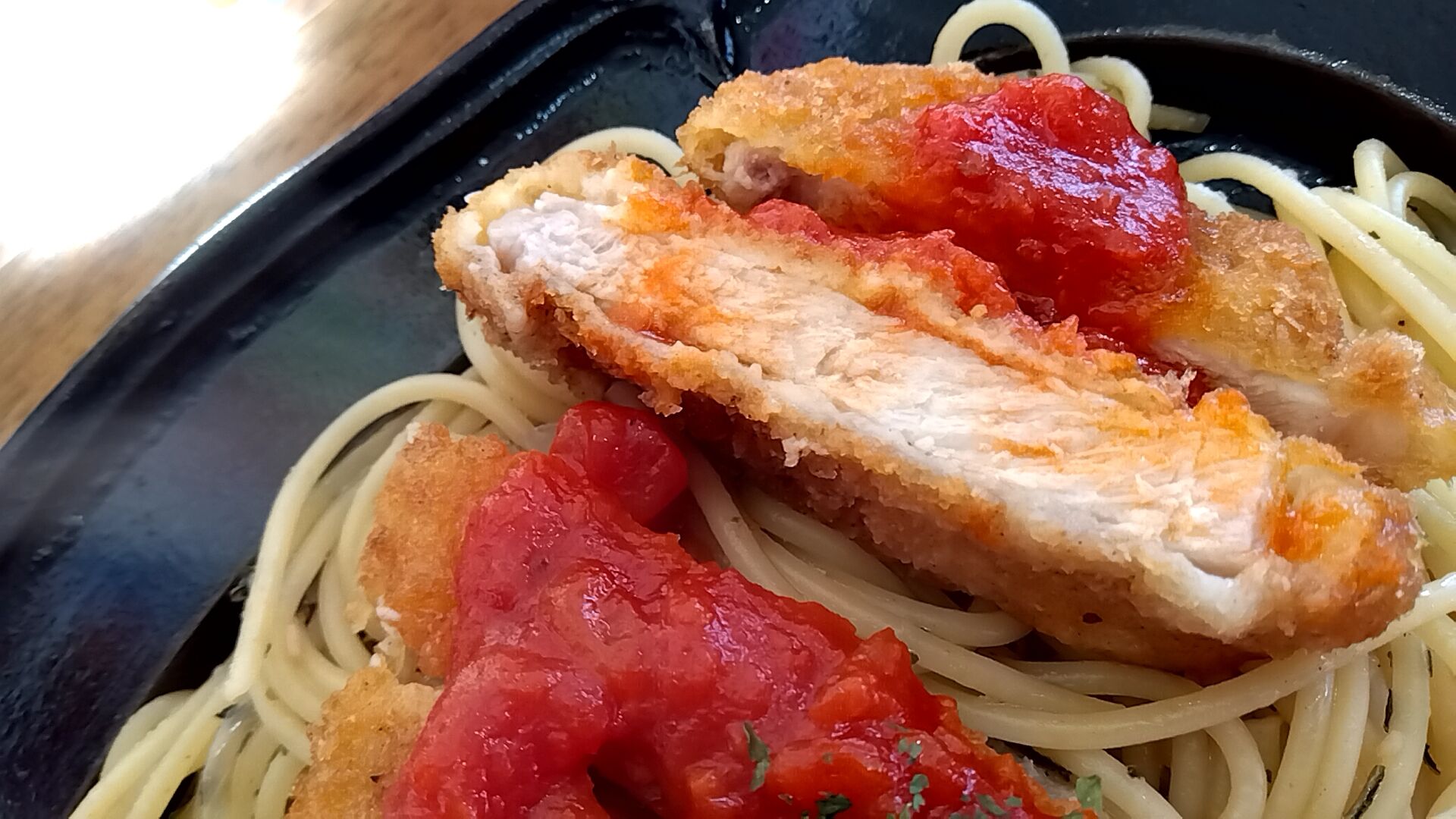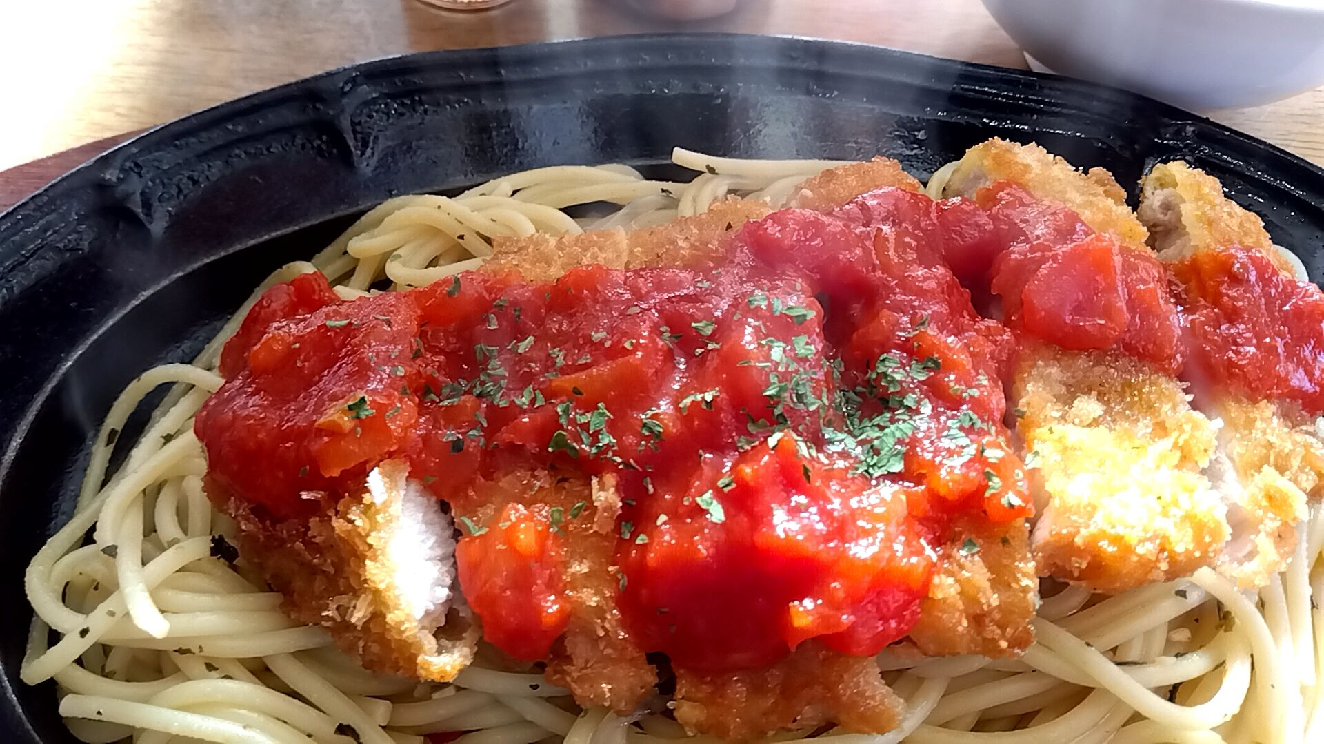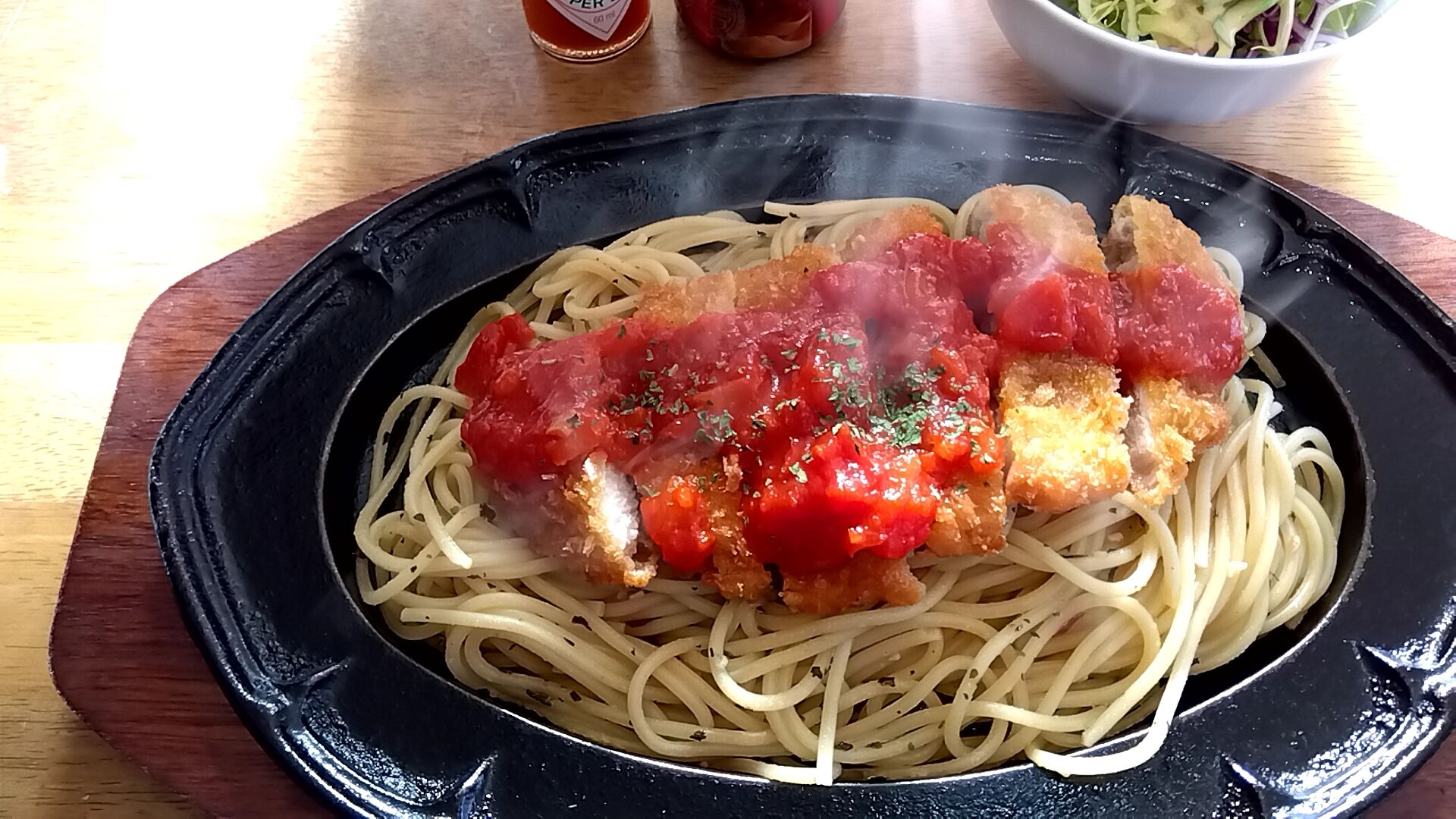 湯気が濛々と立ち上がるポークカツ&スパゲッティ🎵