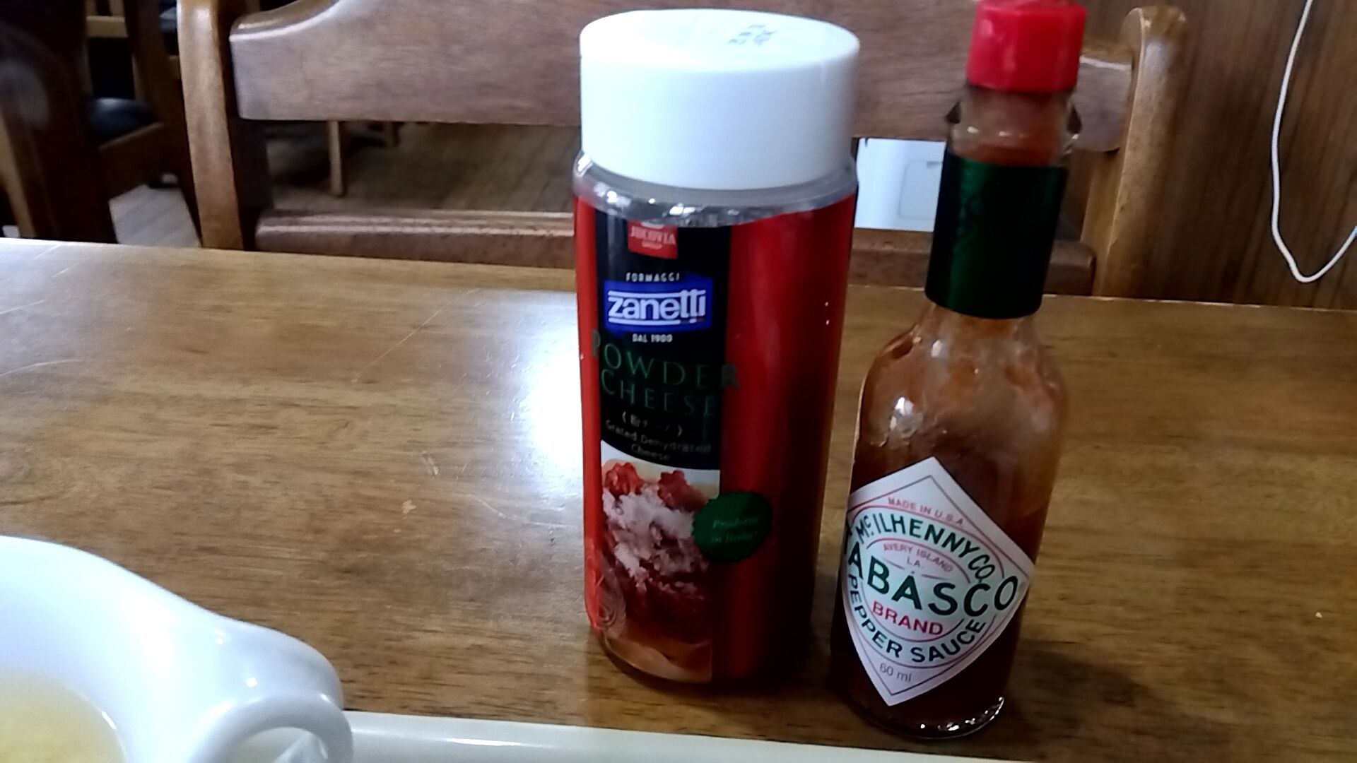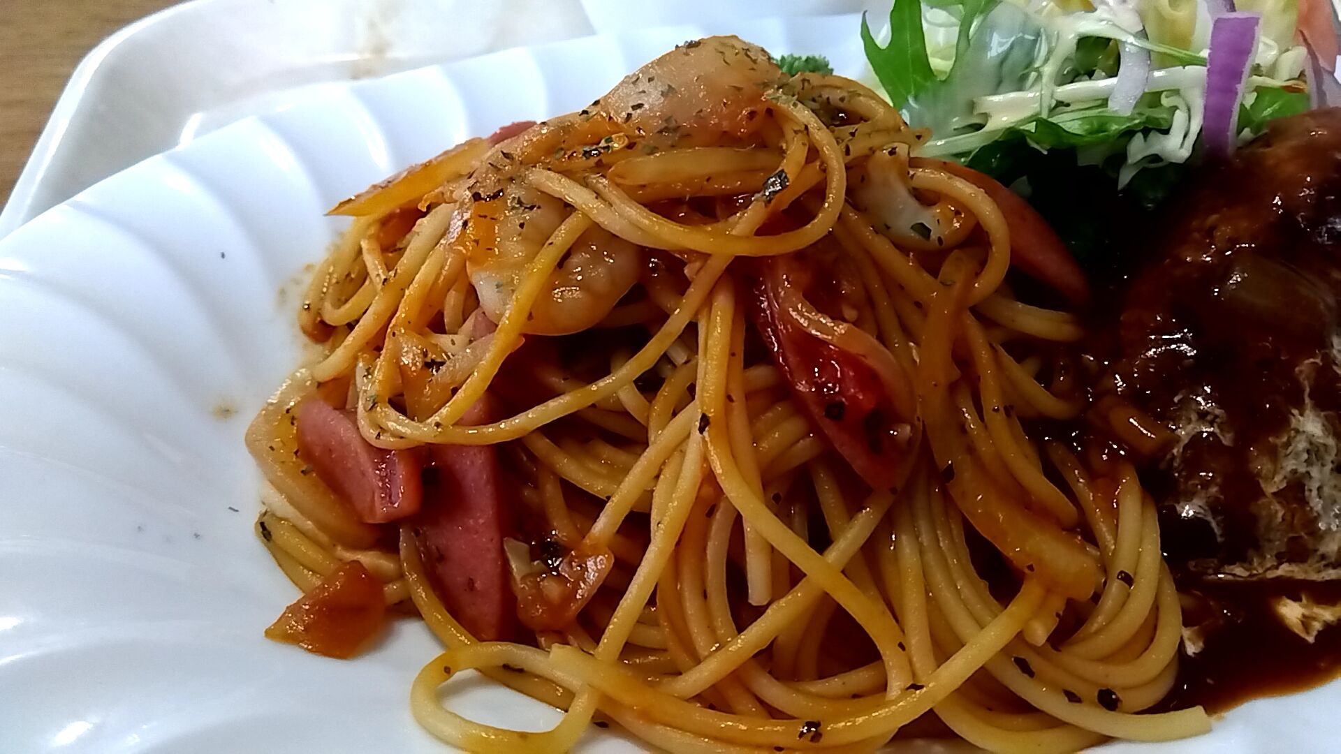 酸味控えめナポリタン、具材はウインナー・ベーコン・エビ・イカ・ピーマン・玉ねぎ・トマト。