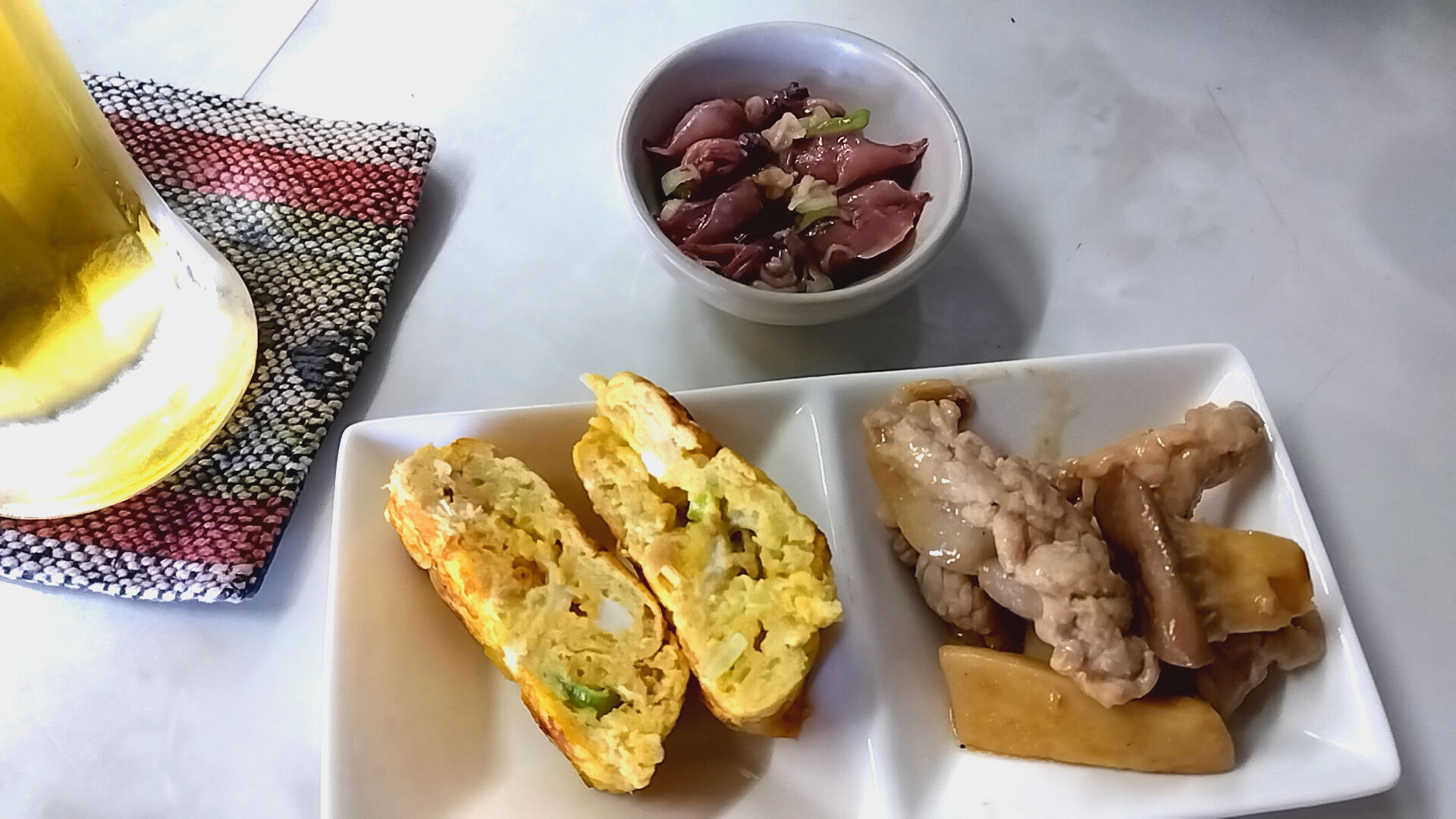 ホタルイカの酢味噌和え・卵焼き・豚肉とエリンギの炒め物。