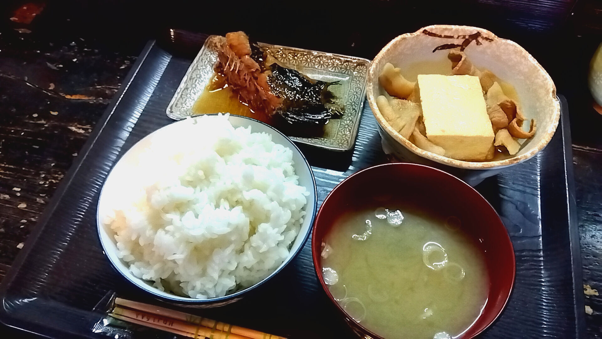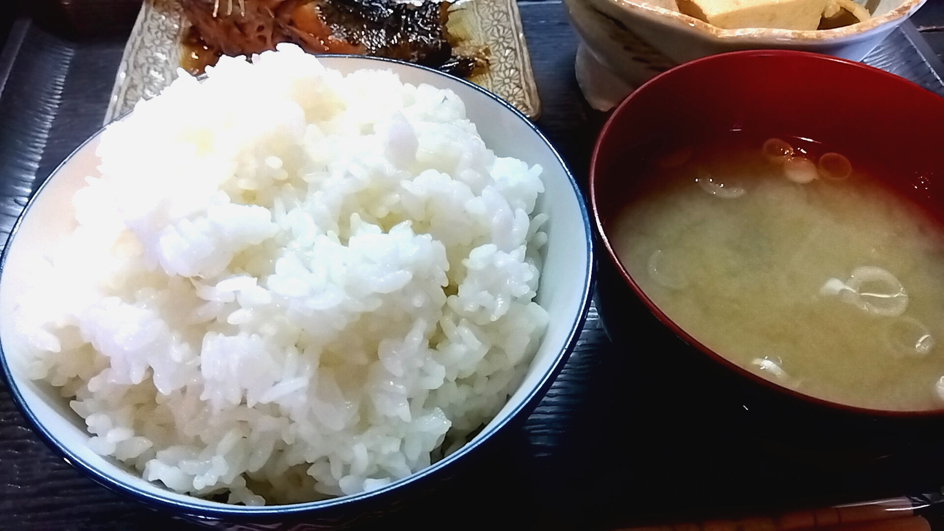 大盛りご飯・ネギとワカメの味噌汁。