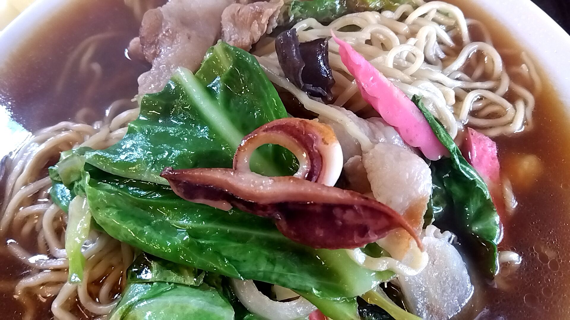 具材は豚肉・キャベツ・玉ねぎ・木耳・イカ・ナルト。
