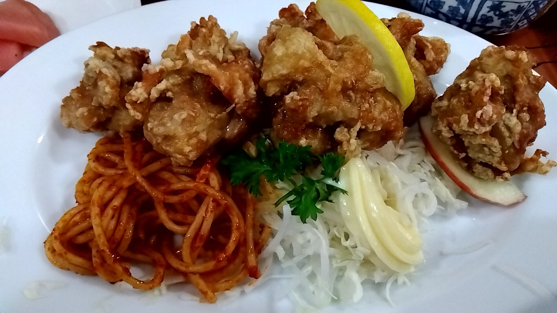 キャベツと大根の千切りサラダ・ナポリタン、薄切りの林檎もあったにゃよ(=^・^=)
