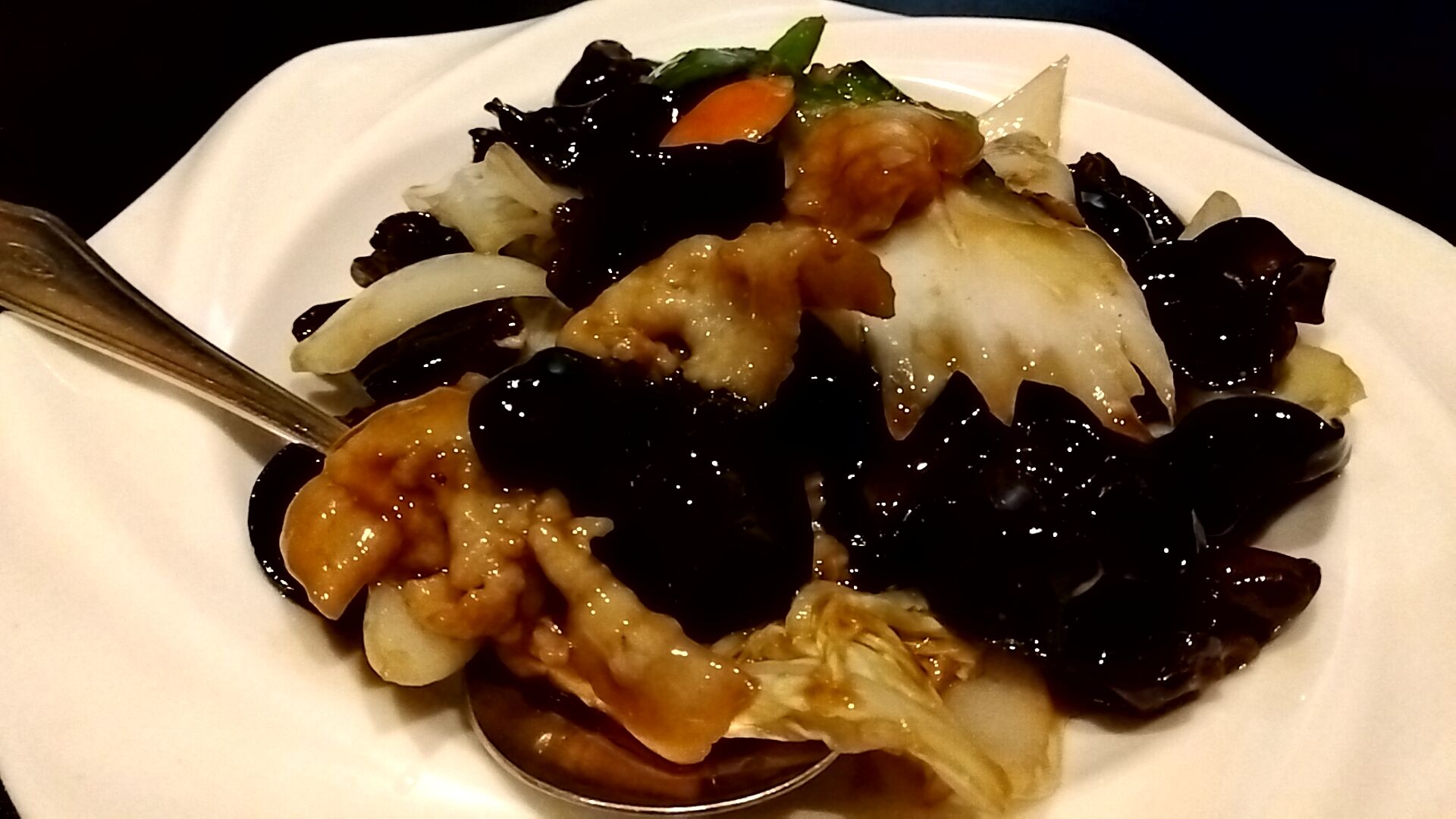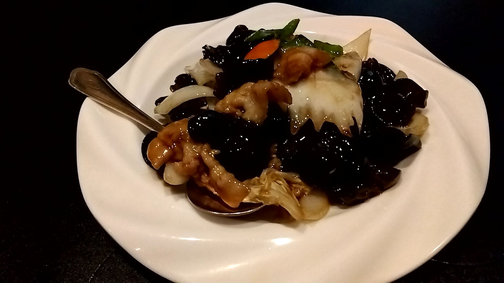 具材は豚肉・木耳・ピーマン・人参・玉ねぎ。