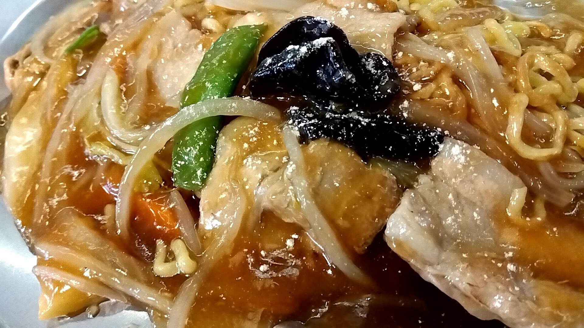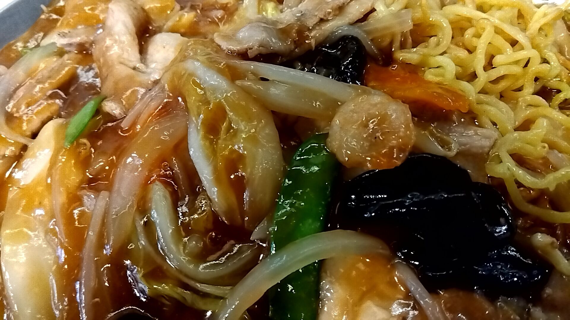 具材は豚肉・海老・人参・木耳・白菜・絹さや・玉葱・筍・モヤシと具沢山。