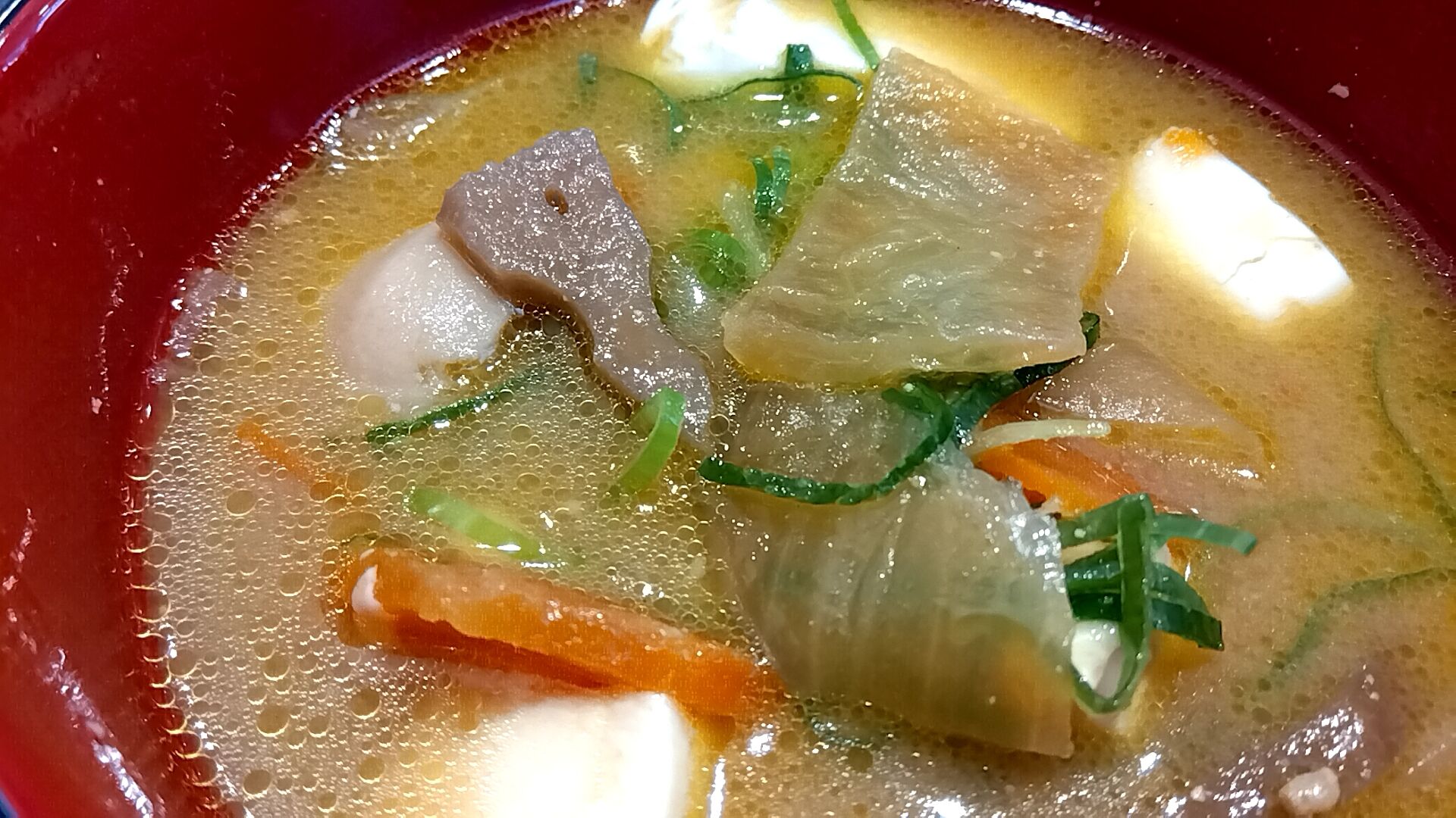 具材は豚肉・大根・玉ねぎ・蓮根・人参・ネギ・絹豆腐。