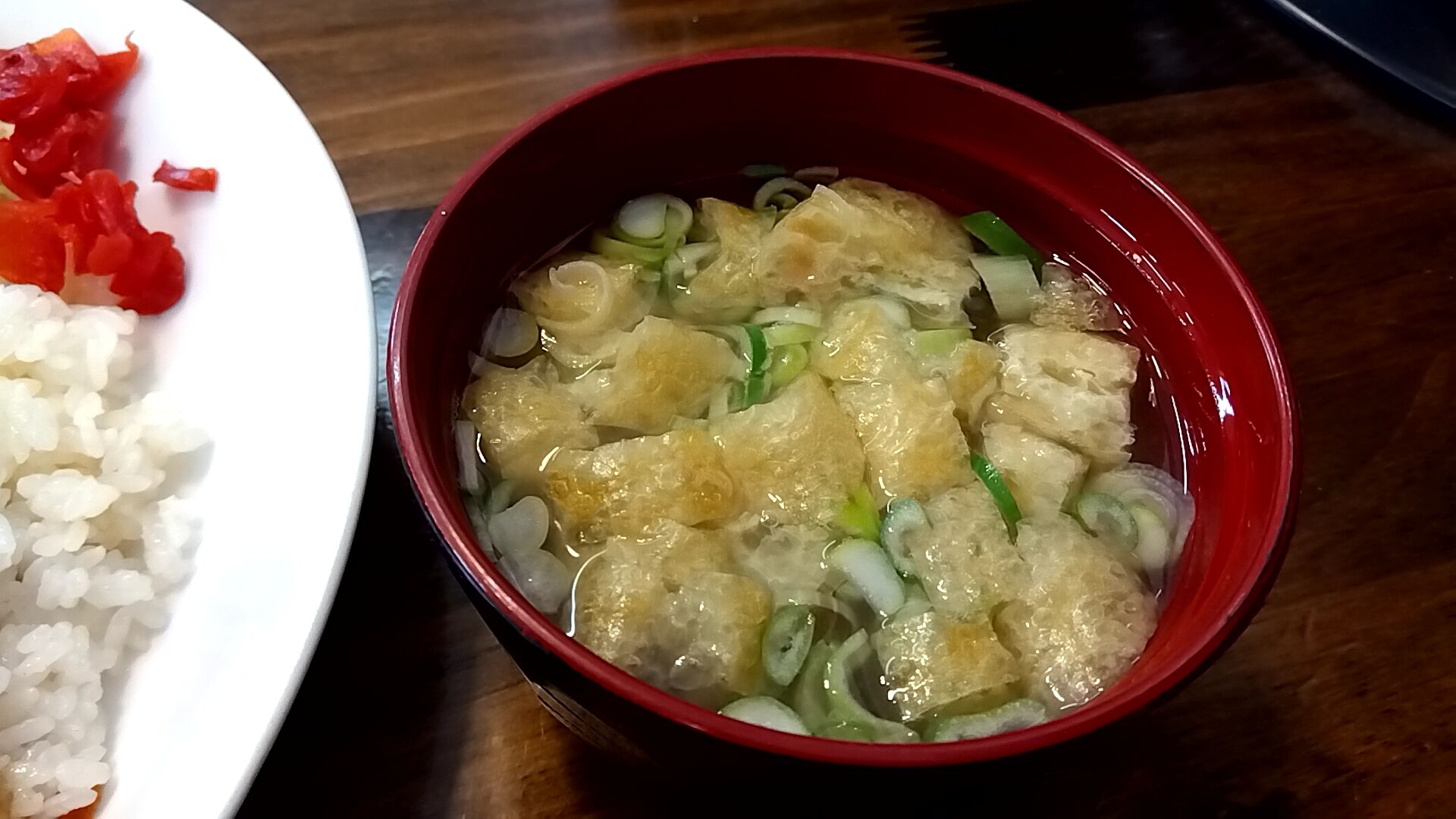 揚げ・ワカメ・ネギの味噌汁、揚げがいっぱい( ̄◇ ̄)