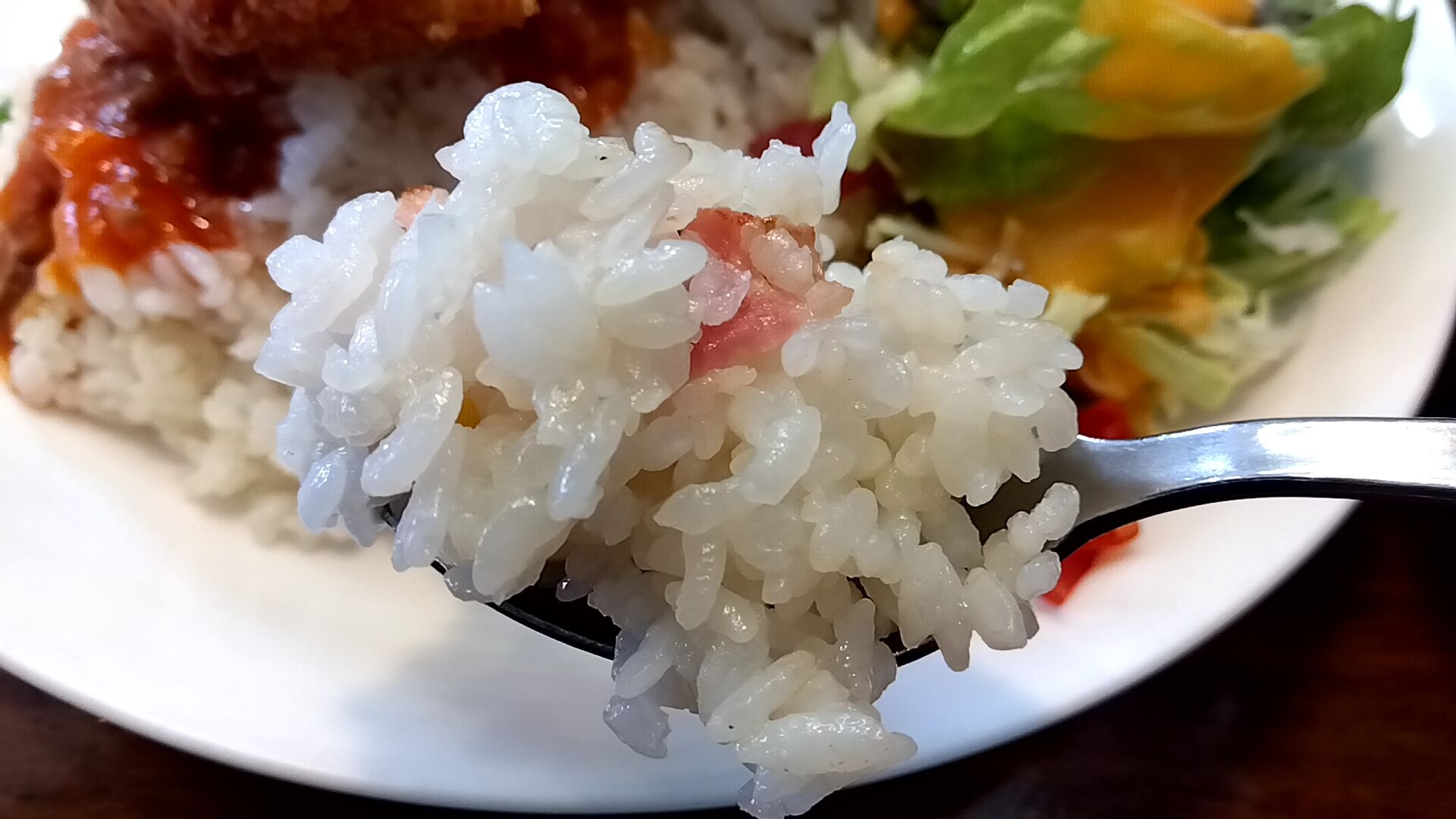 薄味ベーコンピラフ、具材はベーコン・ミックスベジタブル。