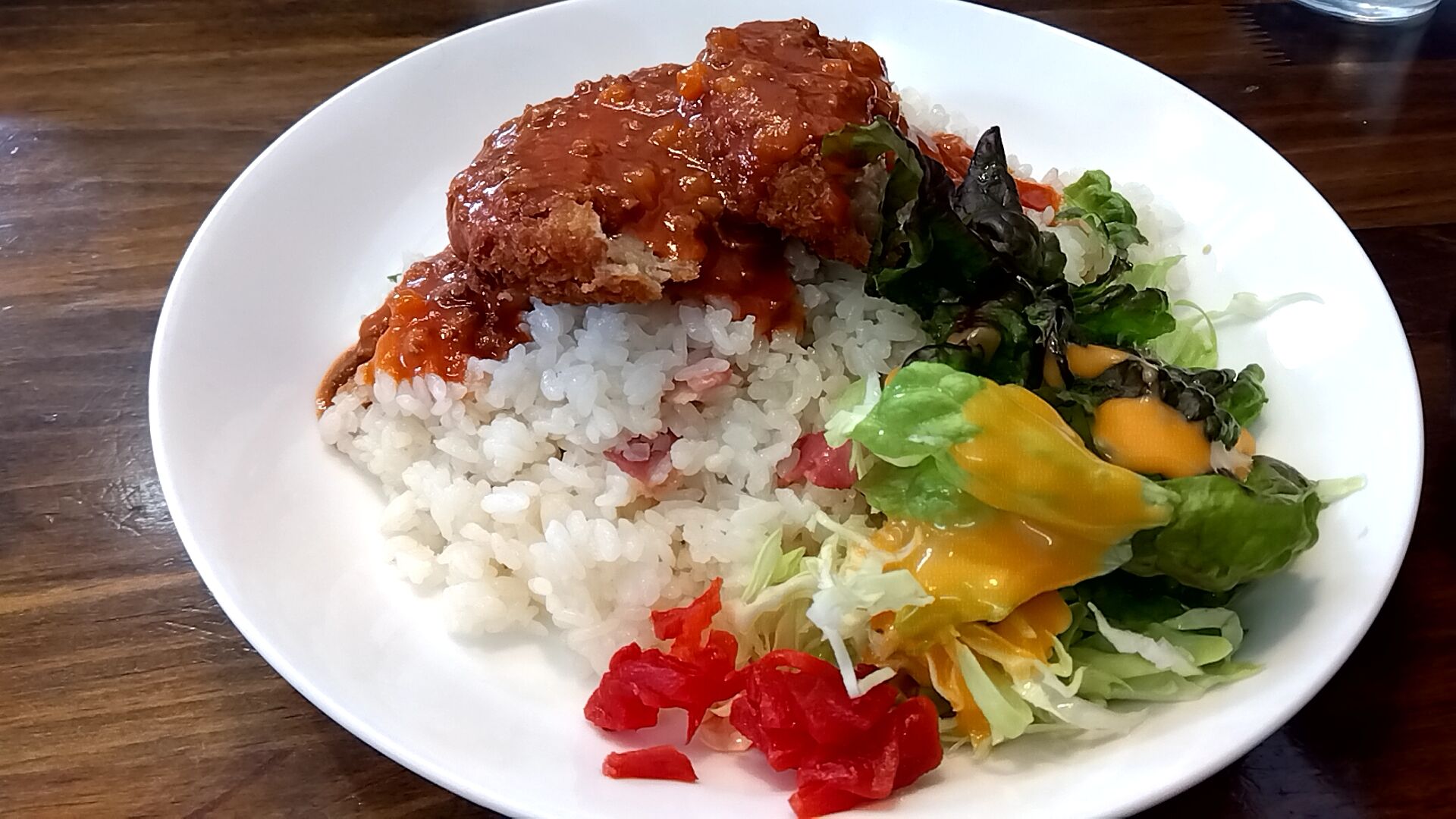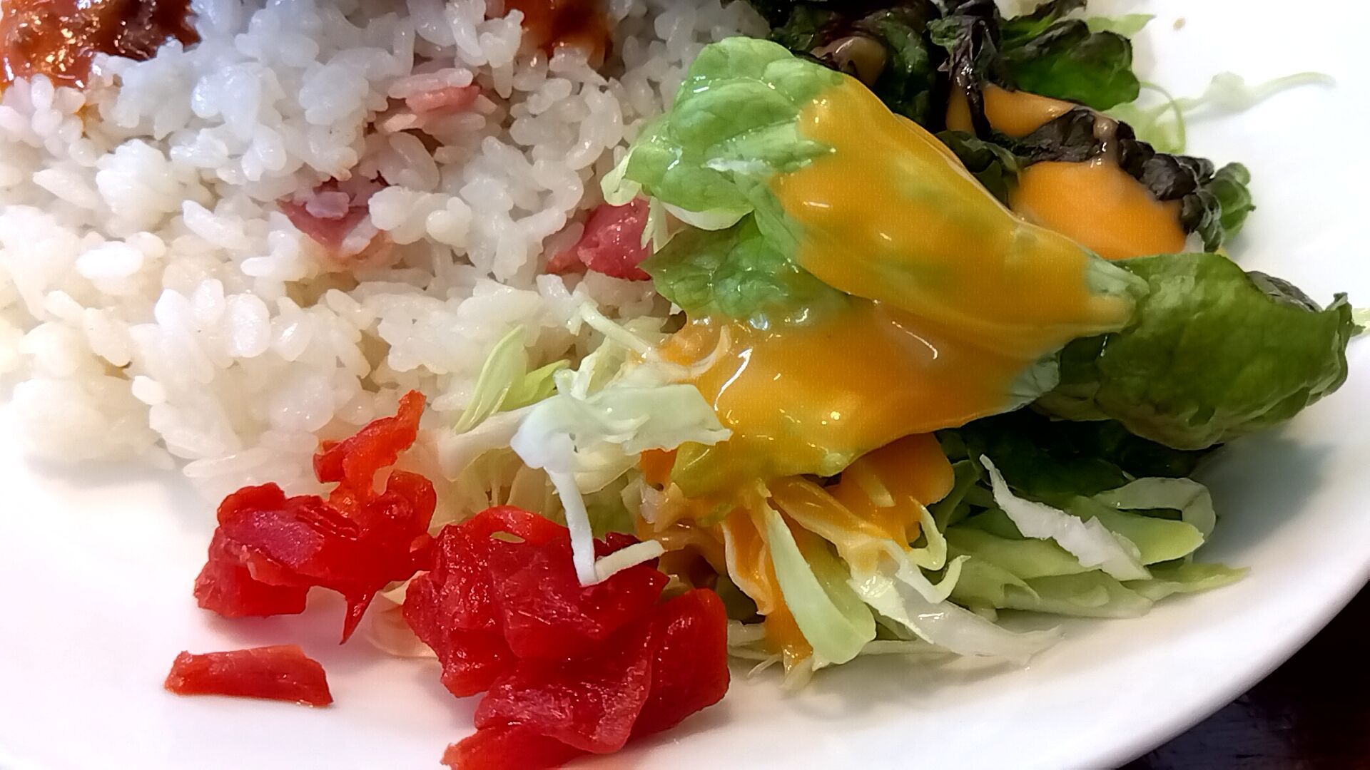 レタスとキャベツのサラダ、福神漬け。