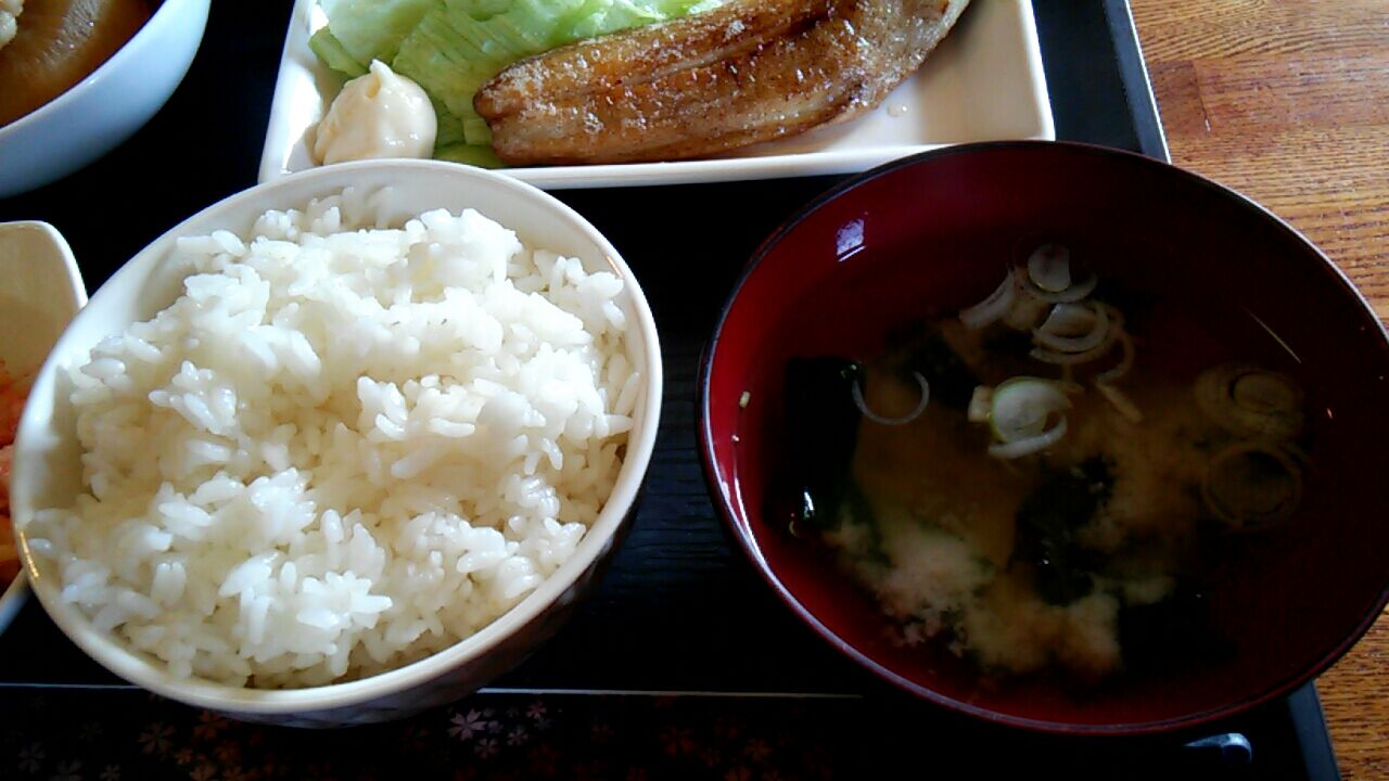 大き目の茶碗に入ったお替り無料のご飯にワカメとネギのお味噌汁。