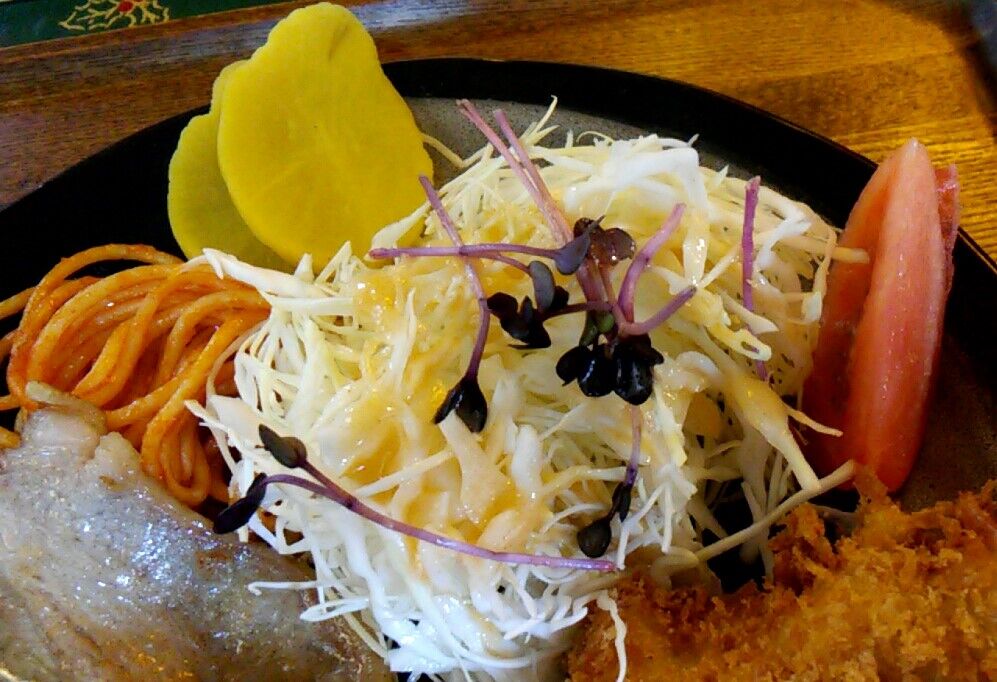 サラダと付け合わせのナポリタン、たくあんが有り難いにゃあ~☆彡