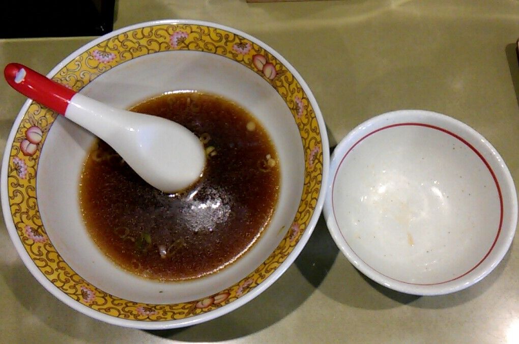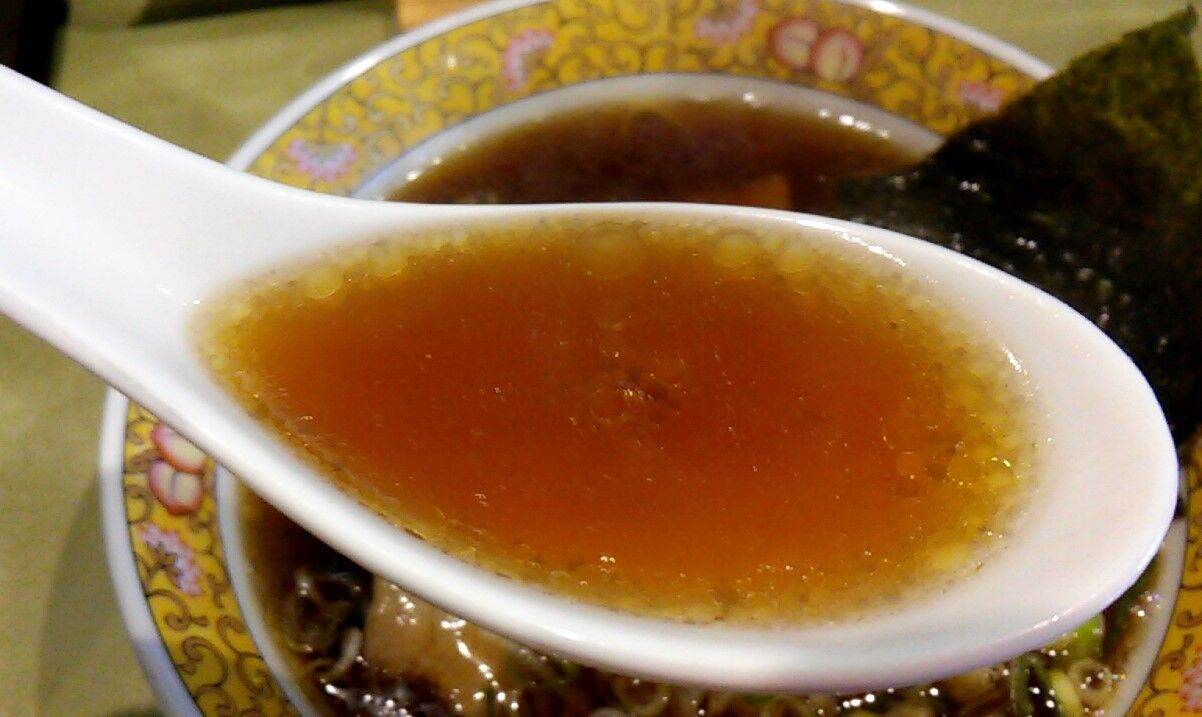 やや濃い目に見えたスープでしたが、レンゲですくってみると淡い琥珀色でしたにゃ。