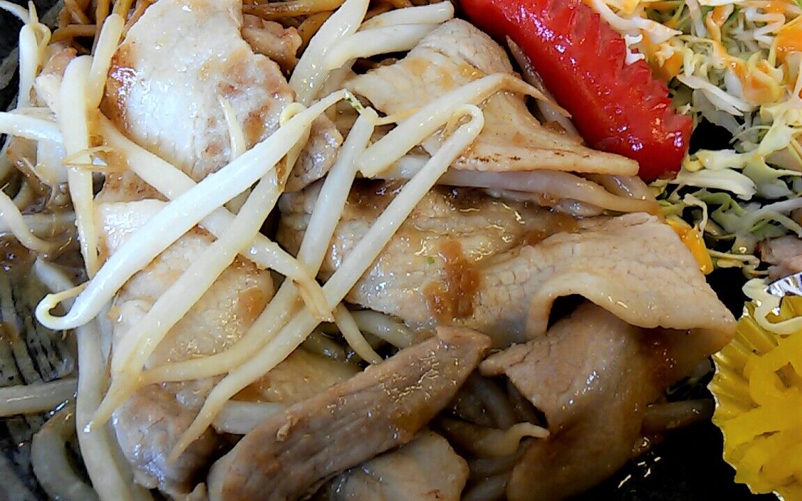 唐揚げ・豚バラモヤシ炒め・焼そば・赤ウインナー・千切りキャベツ・お漬物と言うキャスト達。